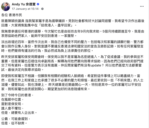 余德寶已連番否認會參選,上周五(17日)在社媒發帖坦承「淡出政壇近四年,當然今次出來,我自己也備受不同的壓力」。他提到,自去年9月接到街坊求助個案,每次與家屬進行請願行動,「警方都會以我作召集人身份,對我宣讀不要違反香港法律和國安法的宣告及錄影記錄。如有任何家屬發言時,他們覺得有違法的行為,我必然成為負上法律責任的那位。」