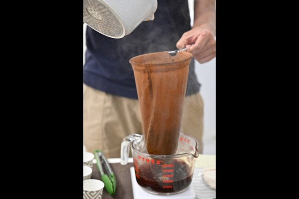 Michael純熟地以泡茶日久,猶如黑絲襪的布袋沖茶。他選用的茶葉是由香港茶餐廳的水吧師傅調配,同樣幼滑順口,再倒入茶餐廳同款的銻茶壺,沖入厚身黑白淡奶杯中。「呢個茶壺係有特別設計的,點解個煲蓋要反轉來用?」全場呆住,「因為個蓋邊太『利』,日日用會鎅到個茶袋,好快就爛。」