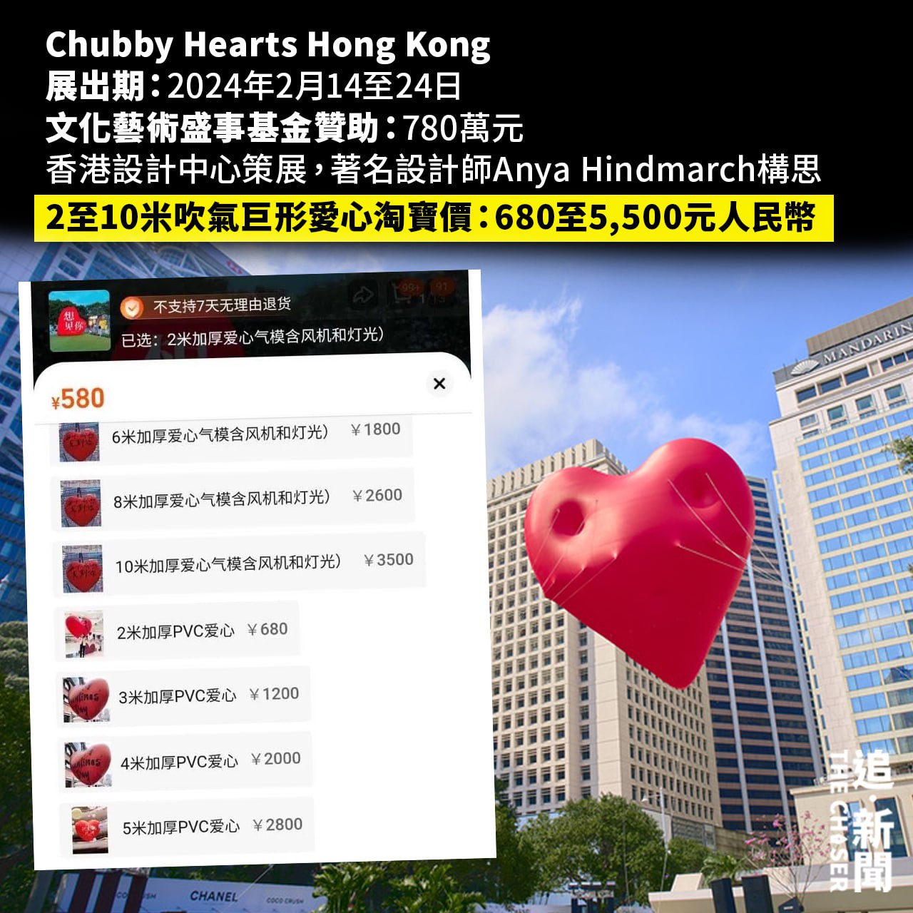 港府大搞當代藝術裝置,上月文化藝術盛事委員會批出780萬元在全港搞「 Chubby Hearts Hong Kong」。獨立股評人David Webb踢爆撥款委員會主席為新世界發展有限公司行政總裁鄭志剛,旗下的K11 MUSEA就有Anya Hindmarch的旗艦店,質疑鄭志剛存在利益衝突。