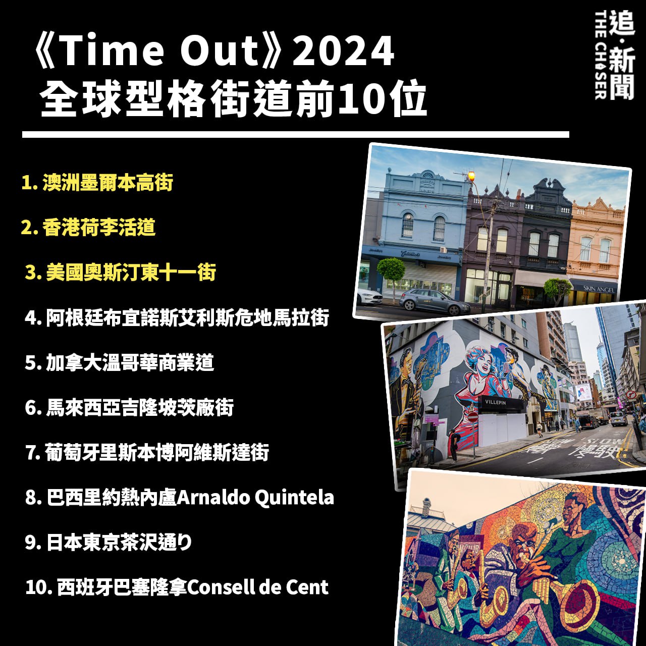 《Time Out》每年收集來自全球城市的意見,就居住地的餐廳酒吧、文化、夜生活、社區聯繫各方面作出評價,再結合各地《Time Out》編輯的意見,選出「全球型格街道」。2022年,上環太平山街取得全球最型格街道第7位後,今年香港憑中環荷李活道再次打入十大,更首次晉身第二名,為這條早於1844年開闢的百年街道留下印記。