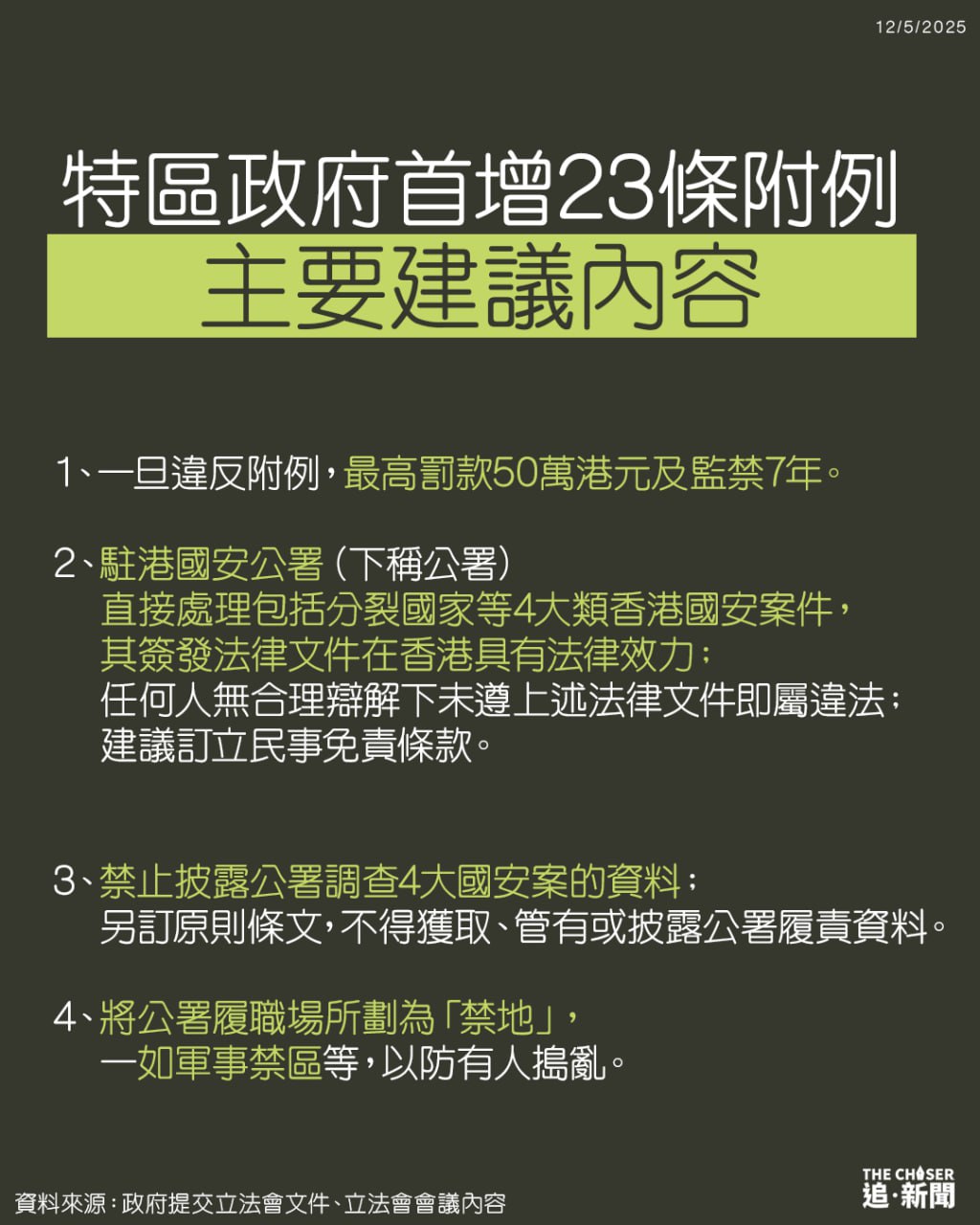 香港《基本法23條》(《維護國家安全條例》)生效僅一年多,特區政府首度提出訂立23條附屬法例,建議將中央駐港國安公署履職場所劃為「禁地」,一如軍事禁區等,以防有人搗亂。學者鍾劍華接受《追新聞》訪問批評附屬法例令駐港國安公署權力無法無天,性質猶如納粹「蓋世太保」:「你走到國安公署走到銅鑼灣,都不要走近國安公署、不要用隻眼望住佢;你用相機影佢相、影佢國安公署招牌,也可能說你危害國家安全,這就是權力的任性。」他亦不排除黎智英案以及支聯會案或受衝擊。