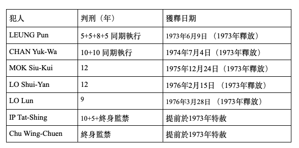 1973年,外交官出身的麥理浩分批特赦六七囚徒,向警署投彈炸傷11人,在太子道投彈導至3死38人受傷的暴徒。兩起重大炸彈案本來被判終身的,最終僅服刑7年就得到港督特赦,並於1973年釋放。