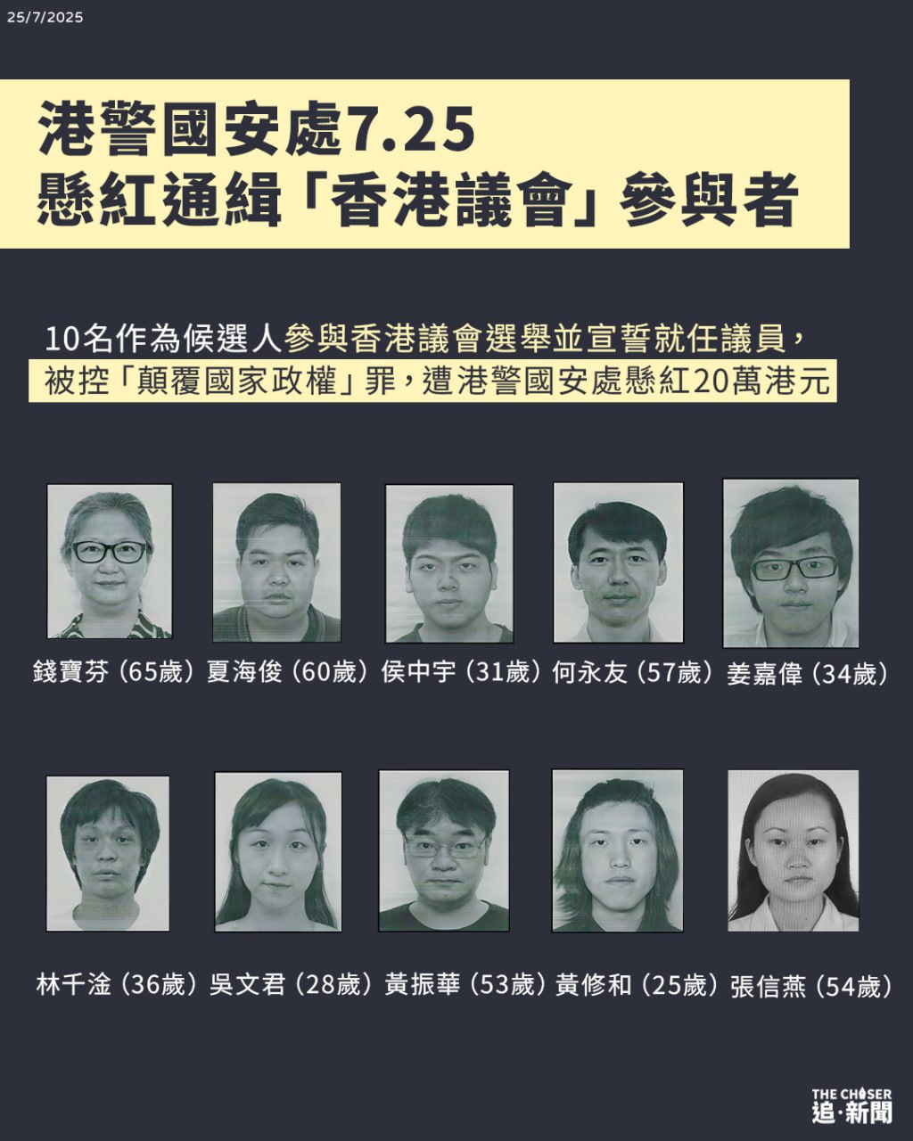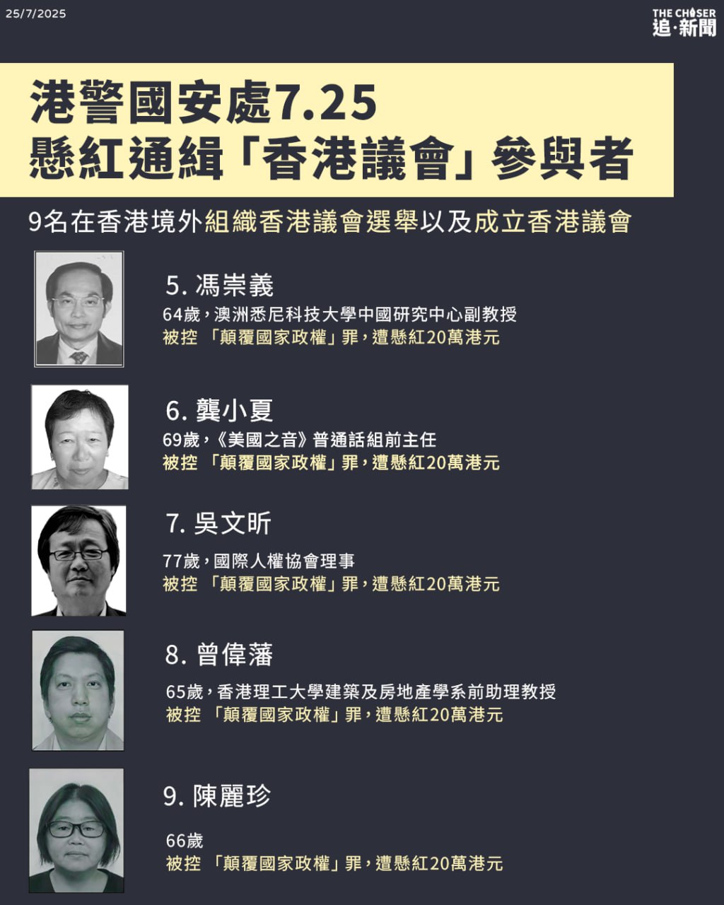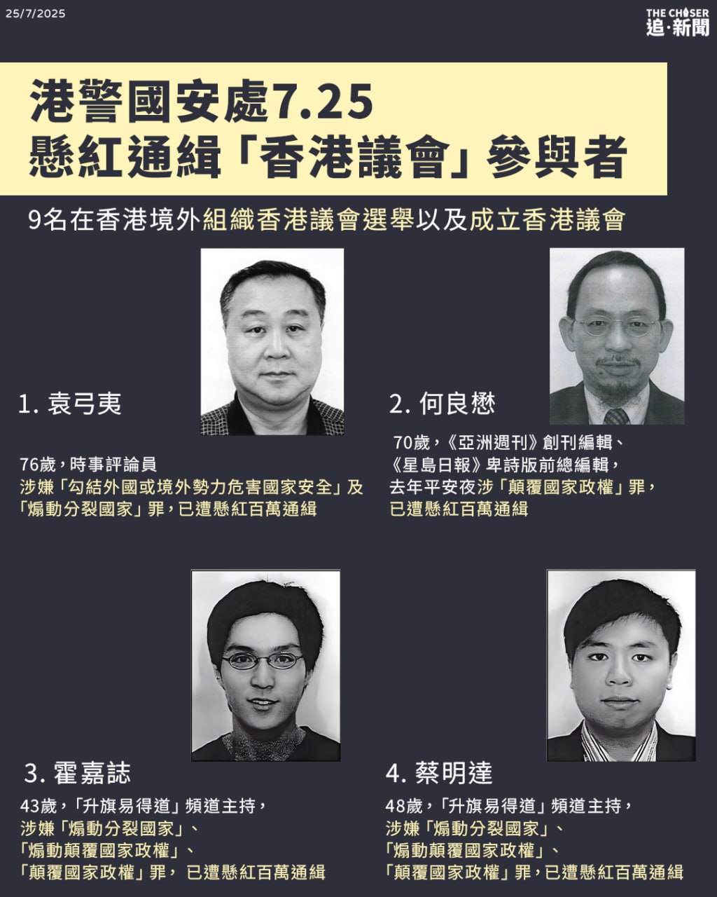 9名被懸紅通緝的香港議會籌組人士分別為創辦人袁弓夷、已解散的籌委會主席兼選舉籌委會成員何良懋、選舉籌委會規則小組主席霍嘉誌、蔡明達及陳麗珍,以及參與議會工作的澳洲學者馮崇義、美籍華裔傳媒人龔小夏,本身為評論員的選委會主席吳文昕,以及選舉技術支援小組主席曾偉藩。