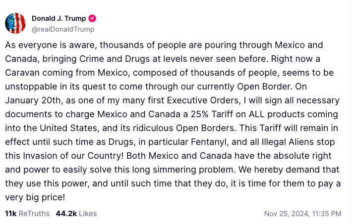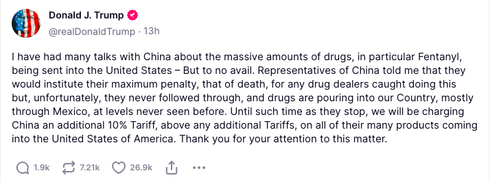 另外,特朗普也向中國「開刀」,他在另一帖文中指出:「中國代表告訴我,他們將對任何毒販處以最高刑罰,即死刑,但遺憾的是,他們並未徹底落實執行,毒品正以前所未有的水平流入我們的國家,主要通過墨西哥。」他在競選期間曾提議,對中國商品徵收60至100%的重關稅,並對所有美國貿易夥伴國的進口商品徵收10至20%關稅。選前的一天,特朗普在匹茲堡一場集會上表明:「我將對墨西哥徵收關稅。他們賣到美國的每一件商品都必須徵收25%關稅,直到他們停止把毒品流入美國。」他還警告,他有權終止中國最惠國貿易地位,如有必要還會徵收高於他在第一任期內實施的關稅。