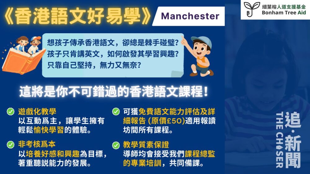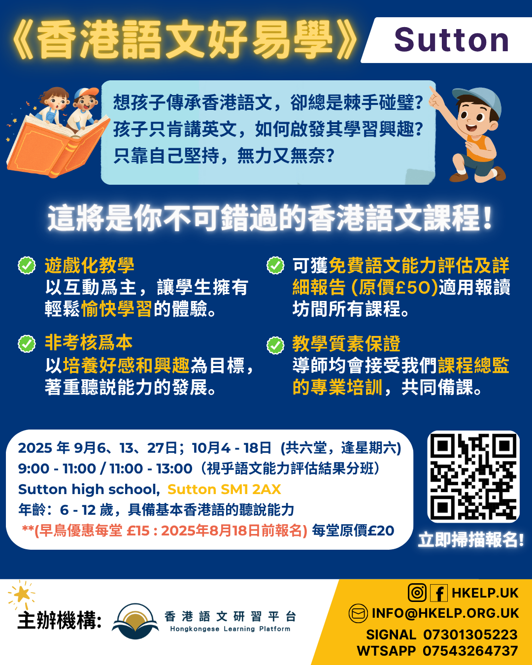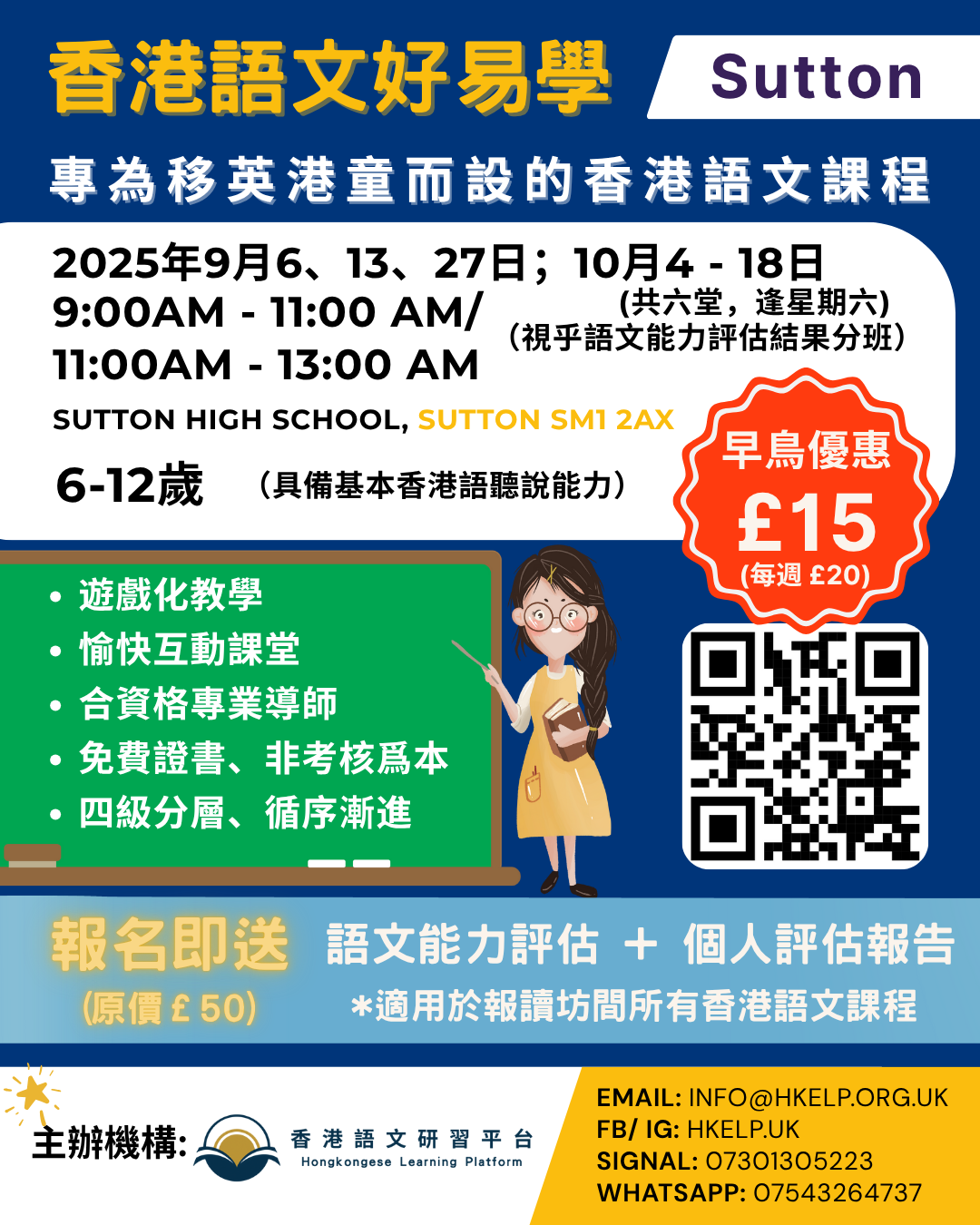 特別優惠: 學生需要參加「學前語文能力評估」(價值 £50),並會獲得詳細的「個人能力報告」,以確定合適的課級(入門級到第三級)。報告適用於報讀坊間其他香港語文課程,而會報讀課程的學生可獲£50學費減免,等同免費進行評估。