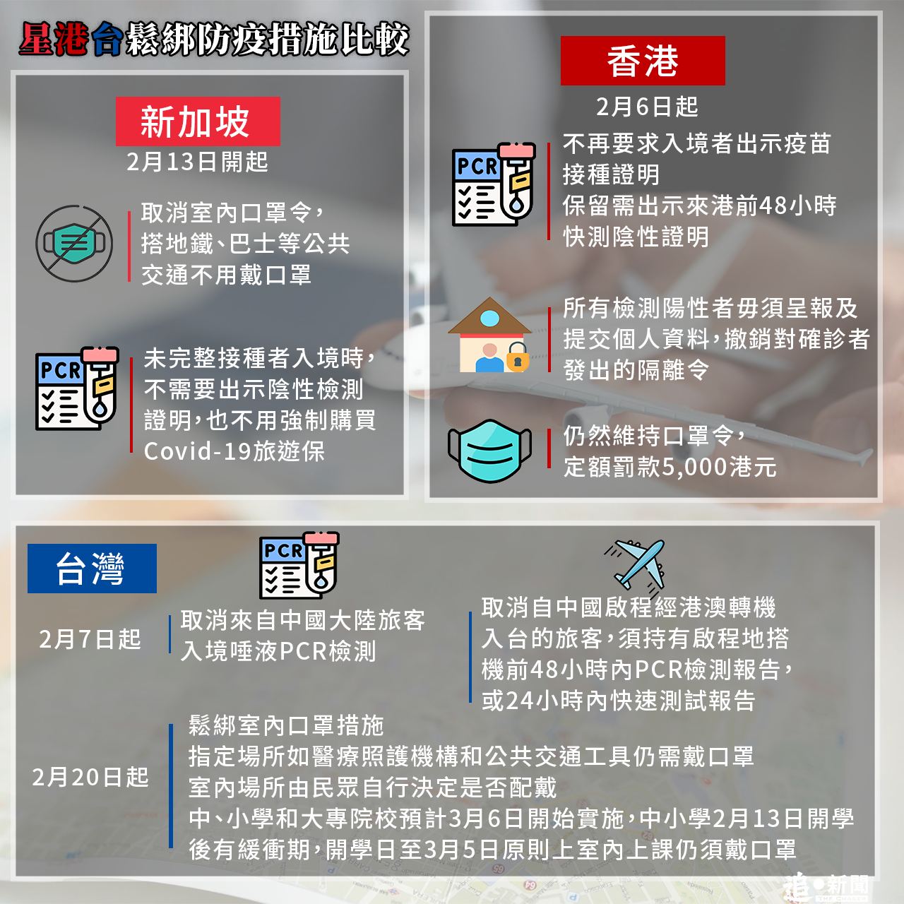 香港仍死守口罩令、保留入境旅客48小時快測證明的「趕客」措施,新加坡、台灣周四(9日)已宣佈防疫進一步鬆綁。新加坡下周一(13日)開始,取消室內口罩令,搭地鐵、巴士等交通工具毋須戴口罩,對「零針」人士也帶來喜訊,未完整接種者入境時毋須出示陰性檢測證明,也取消強制買武肺旅遊保。移居新加坡的港人韋小姐接受《追新聞》訪問時表示,當地市面已回復9成熱鬧,民眾只是搭交通工具和出入醫院才要戴口罩,其他場所都無強制戴,「之前F1、同埋農曆年都搞咗好多大型活動,外國遊客已經逼爆新加坡,政府話下個禮拜搭交通工具唔使戴口罩,大家都好開心。」