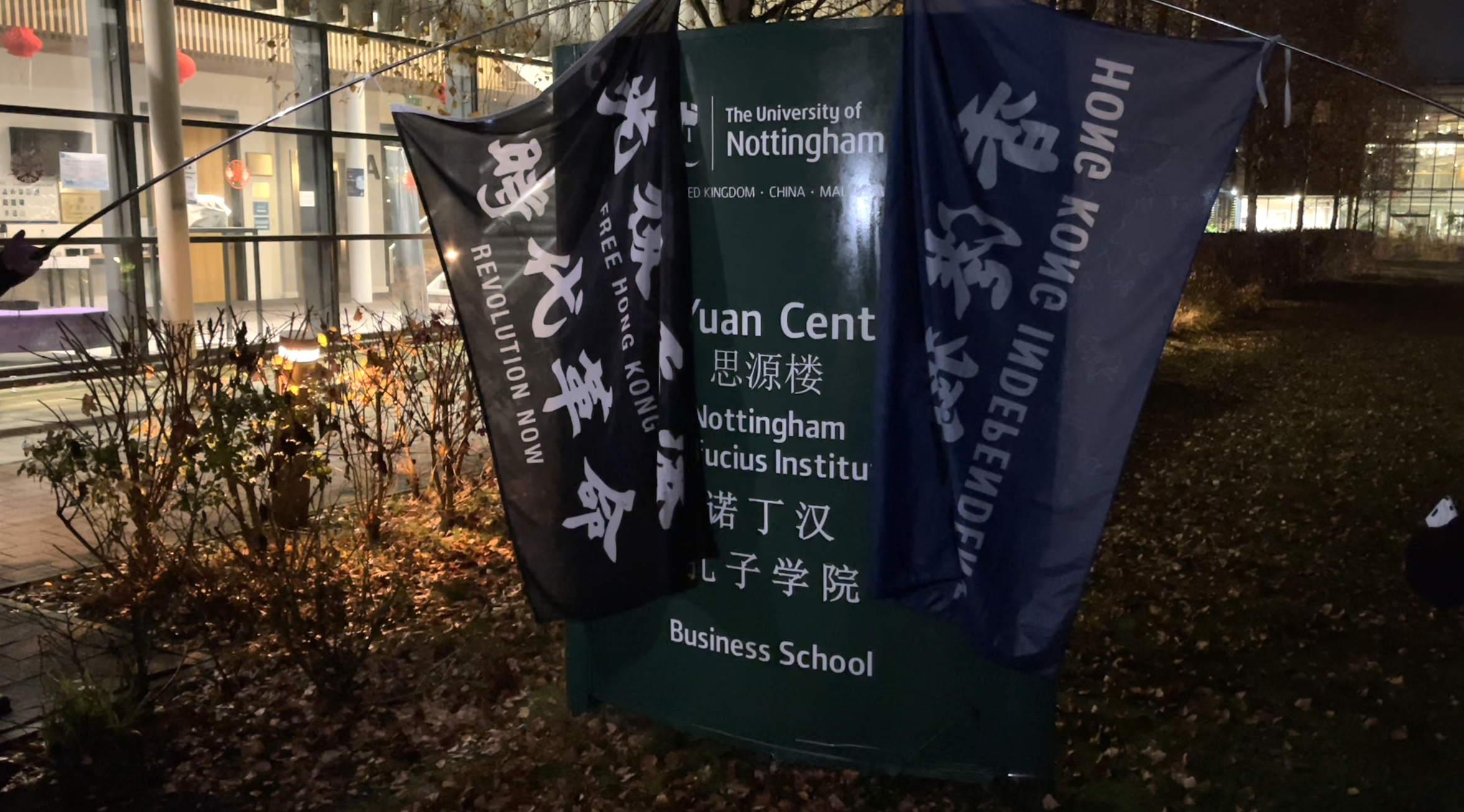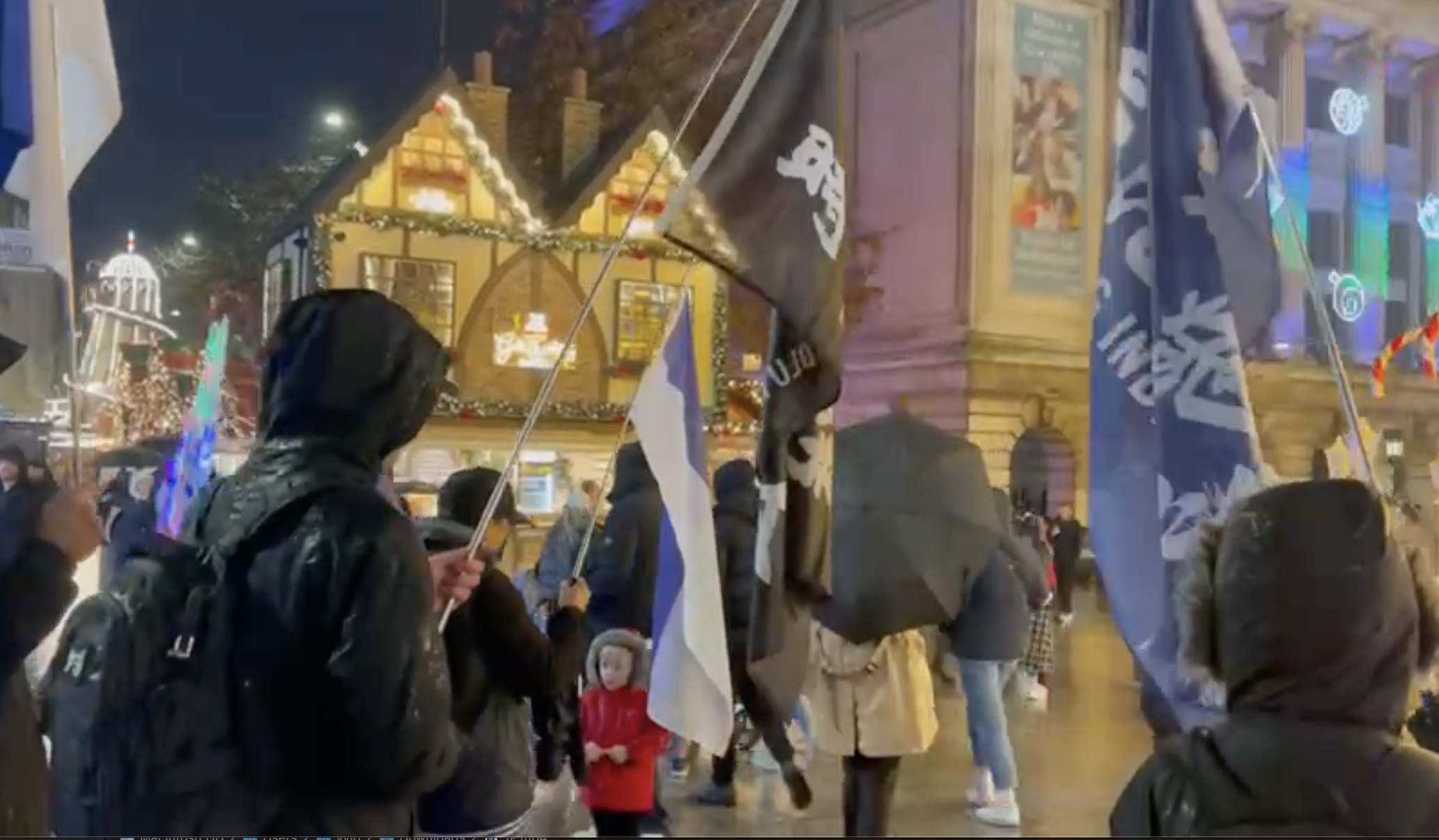「Fight for Freedom. Stand with Hong Kong」;「One Nation. One Hong Kong」;「香港獨立,唯一出路」;「民族自強,香港獨立」。周日下午四時半,室外溫度大約只有攝氏8度,諾定咸市中心Old Market Square細雨綿綿,聖誕市集燈光璀燦,人聲鼎沸,氣氛熱鬧。旗手高舉光時旗、藍白旗以及「香港獨立」等旗幟帶領下,港人遊行隊伍一面高呼口號,一面穿過聖誕市集,經過諾定咸城堡,走向孔子學院所在的諾定咸大學銀禧校區(Jubilee Campus)。