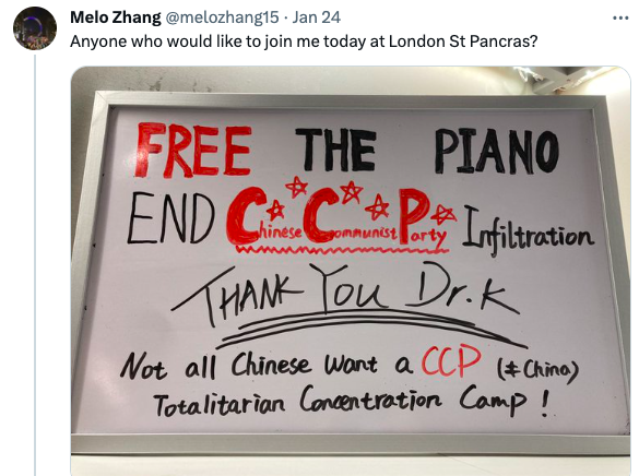 英國鋼琴家「Dr K」Brendan Kavanagh大戰小粉紅事件愈鬧愈大,Dr K接受名嘴摩根(Piers Morgan)訪問時揚言不排除周五(26日)到St. Pancras火車站即席彈奏。在Dr K仍未重返現場前,一名中國男生周三(24日)在白板寫上「光復鋼琴,結束中共滲透」(FREE THE PIANO, END CCP Inflitration),以及「不是所有中國人想要中共,極權集中營!」的英文字句,另一香港男生則在剛解封的鋼琴演奏《願榮光歸香港》和《Do You Hear the People Sing?》,並轉貼香港人在同一地點「快閃」表演《願榮光》影片。