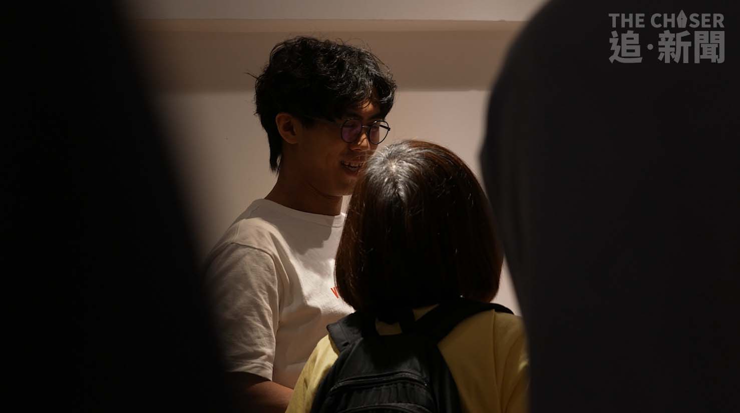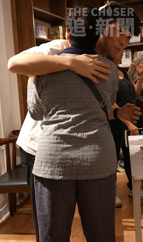 嗲豬奴才(化名)於阿戰在囚時,成爲戰的筆友,這天也是到場的其中一位讀者。阿戰忙着招呼記者、接受記者提問。嗲豬奴才抱着小孩在旁一直默默等候。