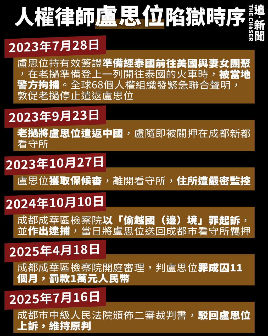 盧思位曾代理多宗敏感案件,包括紀念「八九六四」酒案、12港人案、余文生「煽動顛覆國家政權案」等,他曾遭到司法部門和律師協會打壓和處分,被吊銷律師證。2023年7月28日,盧思位前往泰國途中在老撾過境,遭老撾警方強行帶走扣押。兩個月後,盧思位遭遣返中國,隨即被關押在成都新都看守所,期間他的家屬和朋友均無法與他取得聯繫,也不知道有否受到虐待或酷刑。盧妻直至2023年10月、失聯91天後才接獲丈夫的消息;2024年10月,成都成華區檢察院決定逮捕盧思位,當日送往成都市看守所羈押,直至今年4月18日才送上法院判刑。