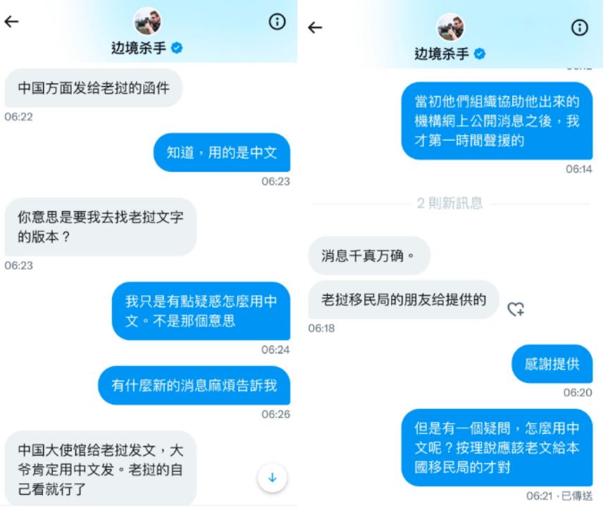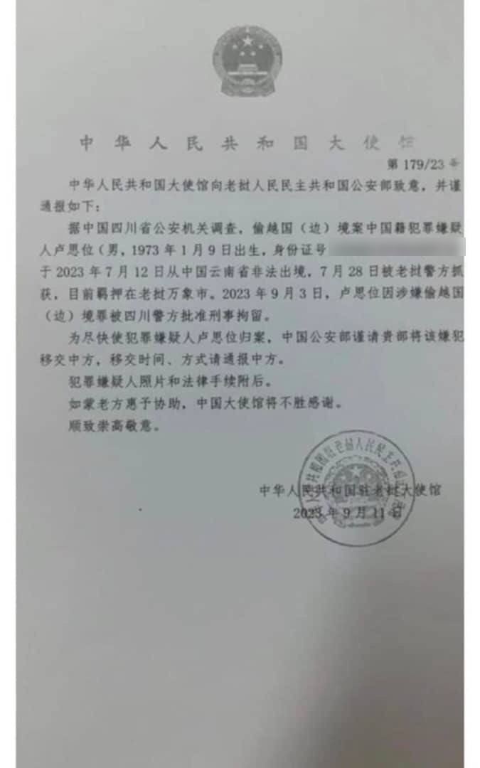 社交平台X發出一張由中國駐老撾大使館的官式文件,指中國四川省公安機關調查,偷越國(邊)境案的中國籍疑犯盧思位於7月12日從雲南非法出境,同月28日被老撾警方抓獲,目前羈押在老撾萬象市。9月3日,盧思位因涉嫌偷越國(邊)境罪被四川警方批准刑事拘留。為盡快使疑犯盧思位歸案,中國公安部要求將疑犯移交中方,移交時間、方式請通報中方。發帖人透過老撾官方關係取得該文件,但張春曉至今仍無法確認消息的真假,「但不管真假,我都能感受到邪惡未遠離。」她最擔心老撾政府近日將電騙疑犯遣送回中國時,全部都是蒙頭上機,根本無法證實丈夫何時被遣返。