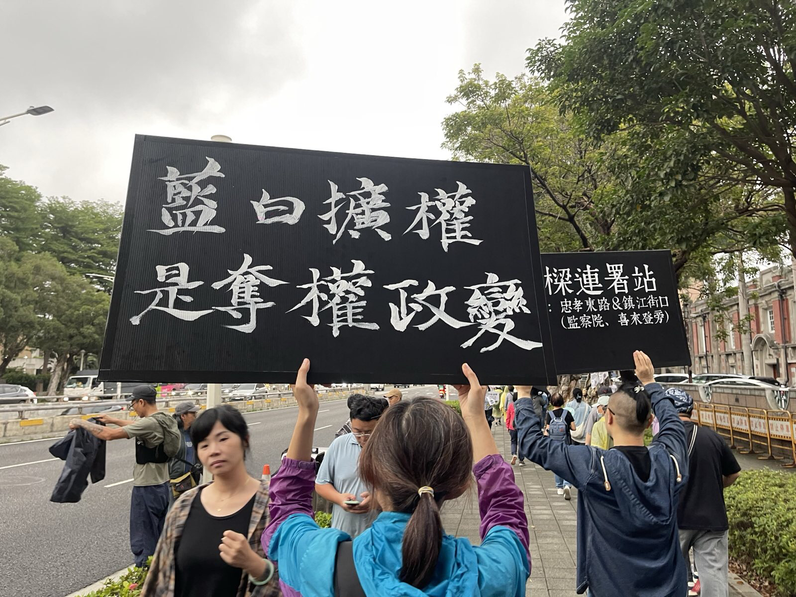 穿上寫有「生於亂世有種責任」上衣到場的在台港人E先生(下圖左一)指,對三讀通過不感到詫異,1月大選時立委三黨不過半,相信台灣人預料到國會岀現類似情況,只是想不到「玩到咁大」。他稱,台灣人當初想藍白成為立法院多數,賴清德做總統,藍白制行總統,事實卻是掣肘,監人勑厚,他反問台灣人是否不知道對岸滲透到立法院。
