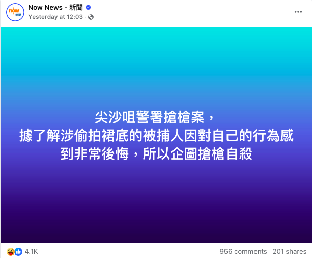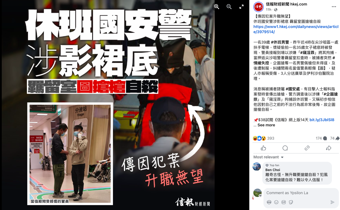 周三(15日),傳媒率先引述「消息」指涉影裙底為休班國安警,然後再獲得的「消息」是「搶槍」的情節,再來補充稱國安警對自己之前的不法行為感到非常後悔而吞槍自殺,就連公信力相對較高的《信報》都大字標題報道指,疑犯「傳因犯案升職無望」,更何況NOW等新聞台將「消息當真相」般作出新聞推播(Push),最終鬧得滿城笑話。網民在社交平台揶揄:「偷拍比人拉仲擔心無得升,正常唔係炒咩?」「警方識得讀心術,知道疑犯感到『非常後悔』。」「高尚情操,感動14億人。」