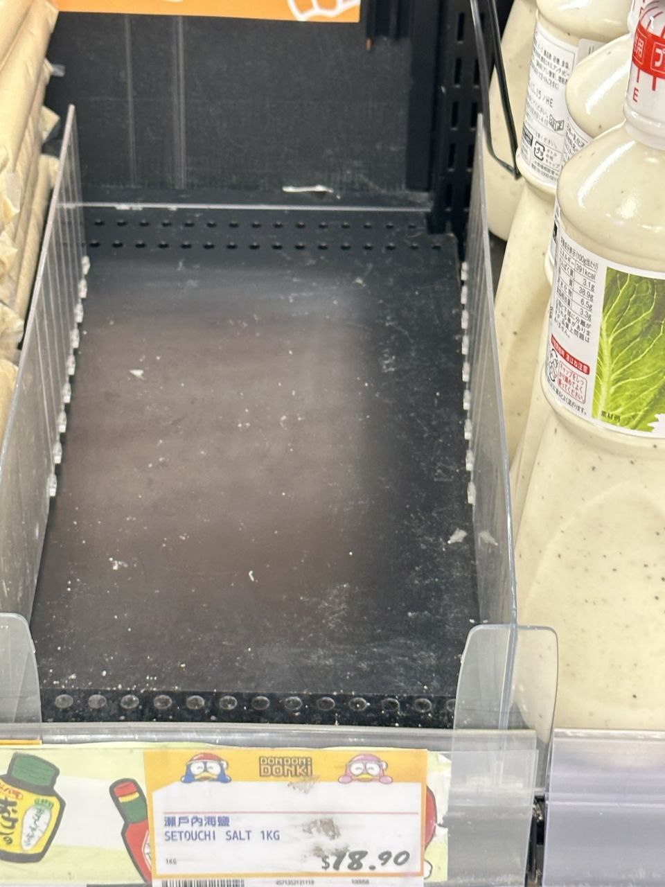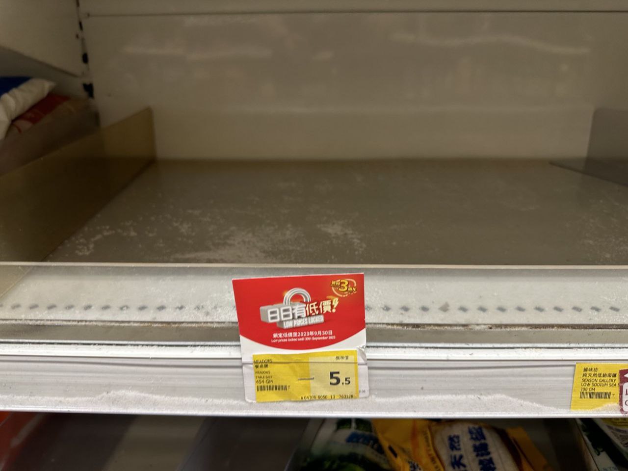 《追新聞》先後到位於荃灣區的「驚安の殿堂」(DON DON DONKI)、TASTE和惠康超級市場分店觀察,其中TASTE超市貨架上食鹽雖仍有存貨,但只是平均擺放於最外圍,營造有貨感覺,貨架深處卻已「空空如也」。至於惠康超級市場的食鹽絕大部分已售罄,餐桌鹽貨架被「清零」,有店員在價錢牌加上「此貨暫缺」標示,只有售價貴數倍的個別產品還有少數存貨。