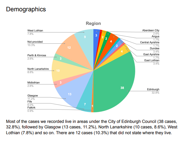 蘇格蘭香港人創辦人之一、前葵青區區議員郭子健接受《追新聞》專訪時表示,目前有1.1萬港人在蘇格蘭居住,而7,000左右為BNO簽證持有人,但選民登記人數則沒有正式統計數據。郭展示向選委會提交的報告顯示,大部份被「DQ」投票資格的港人主要居住在愛丁堡選區(38宗,32.8%),其次則為格拉斯哥(13宗、11.2%),北拉納克郡(10宗,8.6%),西洛錫安(7.8%),以及12人沒有表明居住地。