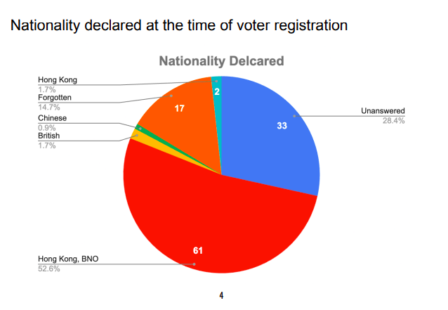 調查又發現,過半數(52.6%)受訪者表明,在選民登記已申明國籍為「香港,BNO」,而75%(87人)沒有收到投票通知書,只有5人收到。過半數即58.6%(51人)在投票當日被個別地區前線職員阻止投票,無故被列為「M類」人士,雖然有選民即時作出申訴卻不能要領,無法在選舉日行使公民權利。
