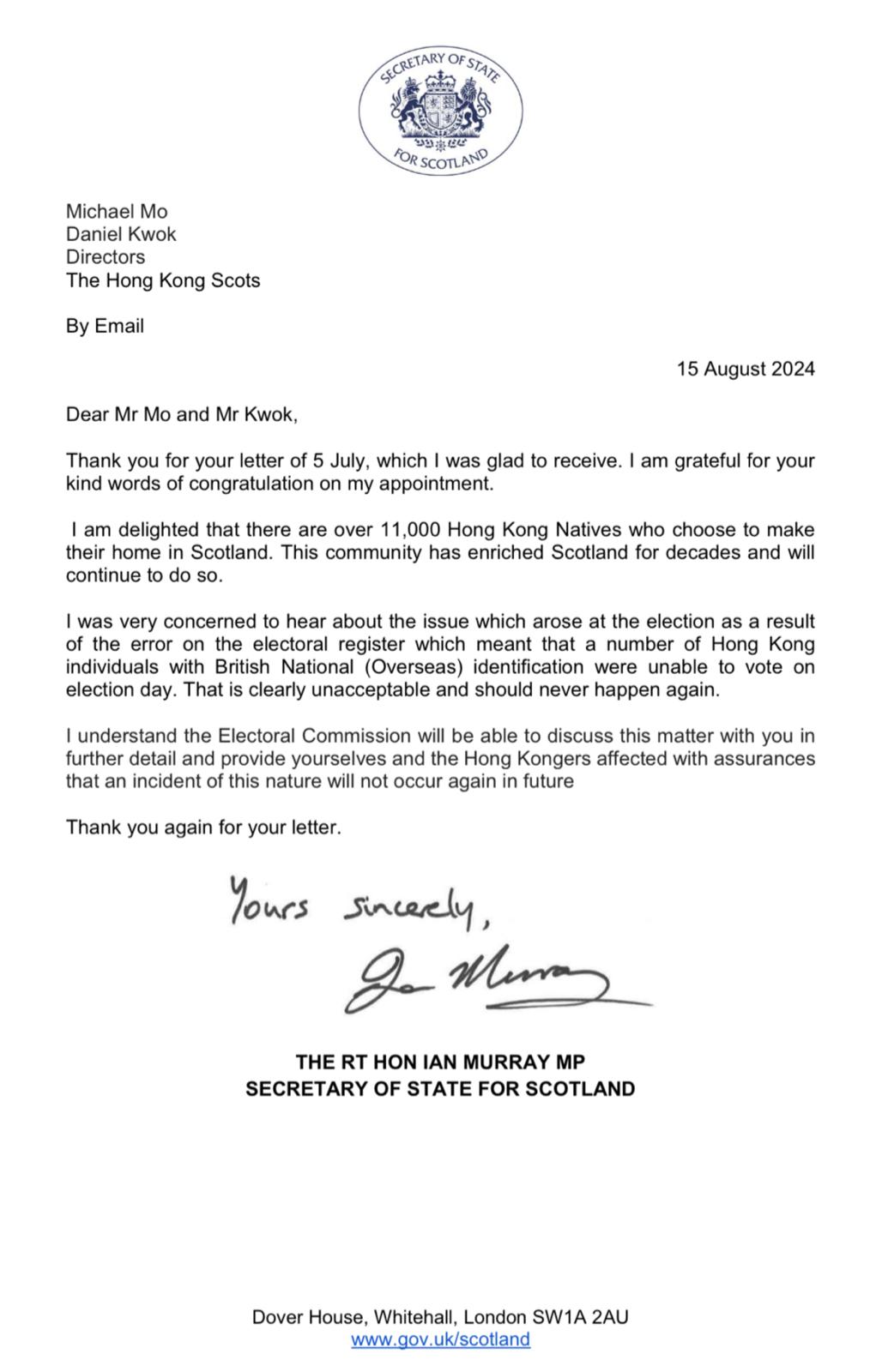 蘇格蘭港人選民資格被「DQ」事件續有新發展,「蘇格蘭香港人」周二(13日)與蘇格蘭選舉委員會反映及討論2024英國大選時,移蘇港人被錯誤分類為「M類」(Missclassified,不能分類),從而被剝奪公民權利,共接獲116名港人投訴未能投票。蘇格蘭事務大臣莫瑞恩(Ian Murray)回覆蘇格蘭香港人的查詢時表示:「非常擔心選民登記冊上的錯誤,這意味着一些擁有英國國民(海外)身份的港人無法在選舉日投票。這顯然是不可接受的,不應該再發生。我向自己和受影響的港人保證,這種事情將來不會再發生。」