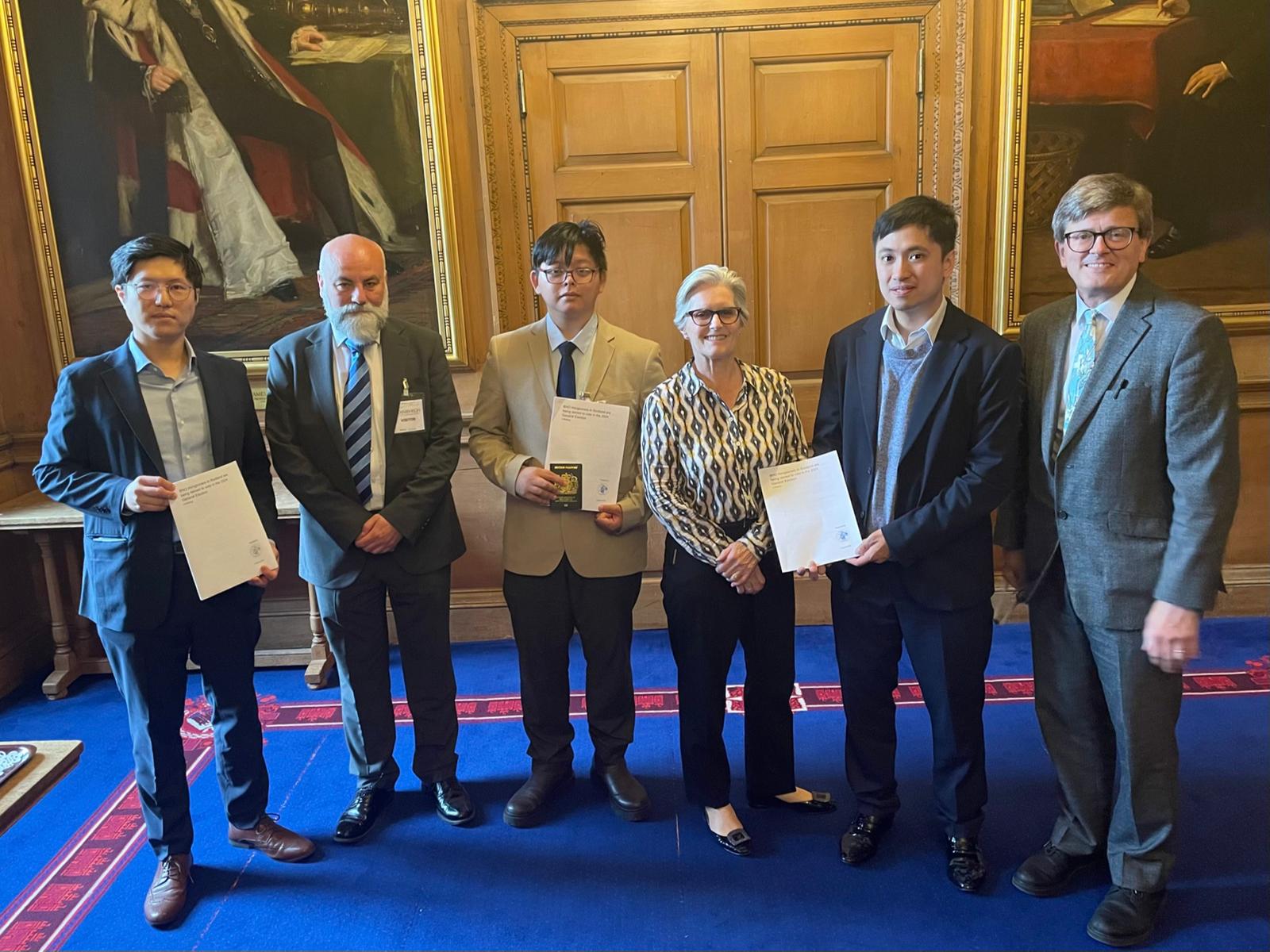 - ▲ (左至右)巫堃泰、Robert Nicol、呂卓浩、Dame Sus Bruce、郭子健及 Andy O’Neill。該會議於愛丁堡市政廳舉行。(郭子健提供)