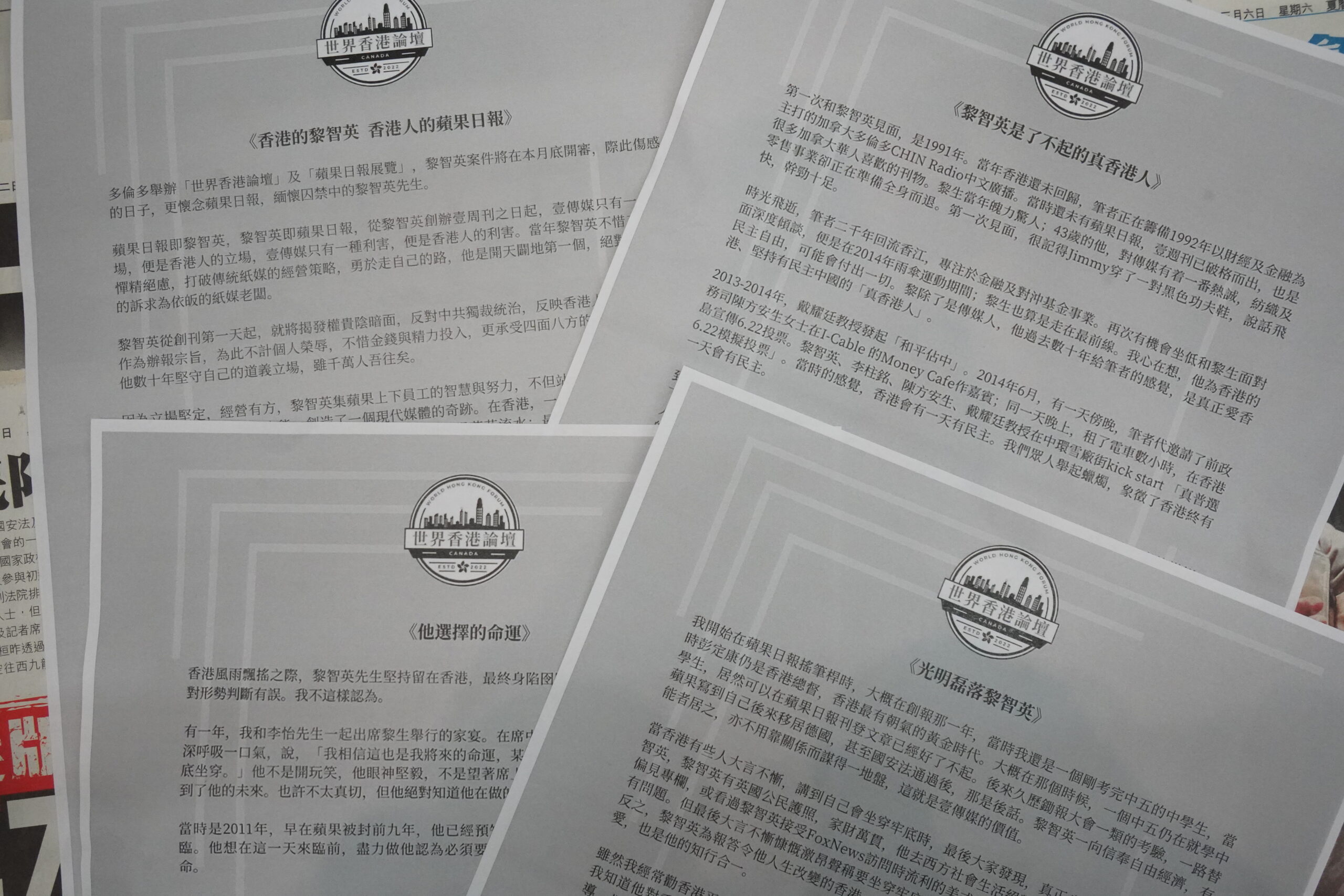 另外場地同時亦舉行《蘋果日報》展覽,主辦方展出多份《蘋果》報刊,也有六名前《蘋果》專欄作家錢志健、高慧然、顏純鈎、羅傑斯(Benedict Rogers)、黃世澤、利世民,再度就《蘋果》撰寫的文章,主要以壹傳媒創辦人黎智英為主題。錢志健表示,黎智英為中共政權其中一個重點打壓對象,因此希望透過展覽提醒12月18日即將開審的《蘋果》案。