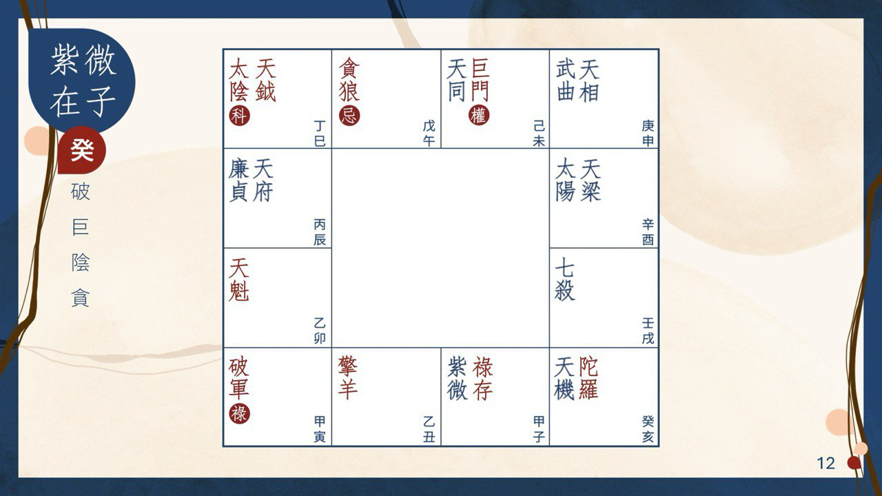 破軍化祿於寅是此盤活躍的一格,最身水身汗的位置了,化祿把破軍的親力親為、實際草根性質再加強,若放到鄉村的處境,這一格幾乎可以看到一個戳力的農夫,不辭勞苦,日日開墾。