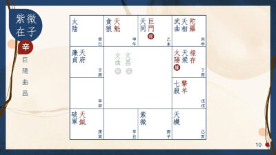 辛干有文曲化科和文昌化忌,但坐落何方則無定局,只能見盤才拆解。但假若文曲化科落在寅位(用寅做例皆因流運曲科正居站於寅),這另一格先天田宅位就滿載矚目且優秀的技術意味,提供進一步關乎大環境的訊息。當然破軍開墾勞動的性質強,是何種技術,可以斟酌。