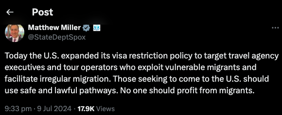 中國三中全會開幕前,美國國務院周五(12日)宣佈,對在香港、新疆和西藏參與「鎮壓被邊緣化的宗教和族群」的中國、香港官員實施簽證限制,但聲明中沒具名列出受到簽證限制的官員及具體人數。國務院發言人米勒(Matthew Miller)稱,由於簽證涉及私隱,國務院不會體體指明哪位官員將會遭美國拒絕入境。