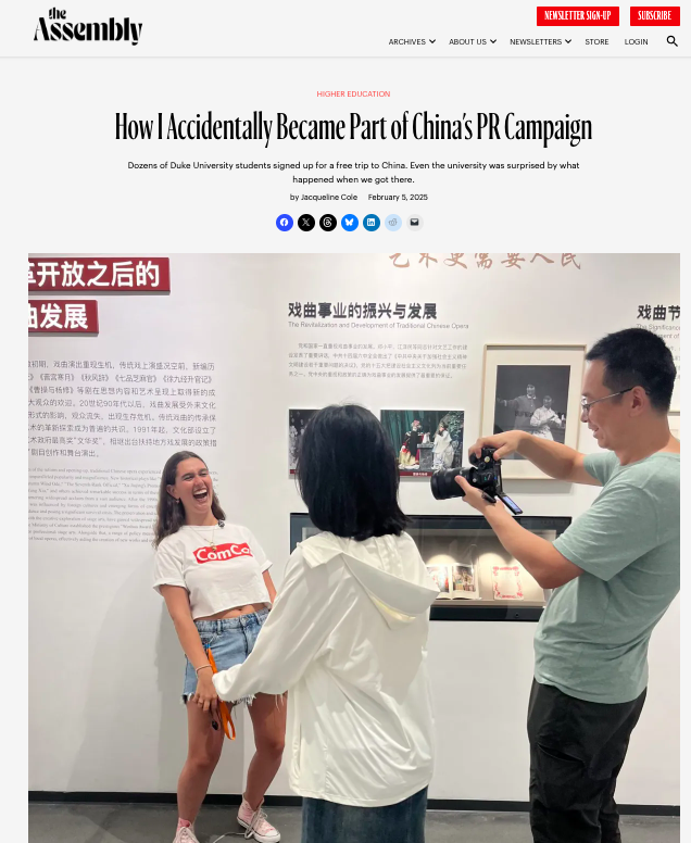 中共總書記習近平為了加強大外宣,2023年APEC峯會宣佈擴大中美兩國青少年交流,在未來5年邀請5萬名美國青少年到中國學習。美國大學生到中國參加「洗腦交流團」有何見聞?杜克大學(Duke University)學生記者Jacqueline Cole上月在網媒《The Assembly》報道去年8月參加江蘇八天遊學團的經歷。她沒想到踏足中國土地就要「配合」共產國家的宣傳樣板戲,獲得一份免責聲明被通知由昆山杜克大學和江蘇地方媒體的專業攝製隊貼身隨行採訪,在8日行程無時無刻不被中國攝製隊團團包圍,還要跟足劇本的設計對白受訪。結果,美國交流生的影片在中央電視台、微信、微博、TikTok等平台迅速傳播,中國駐美大使謝鋒還轉發影片說:「很高興看到美國學生在中國找到通向所有人更好未來的道路。」