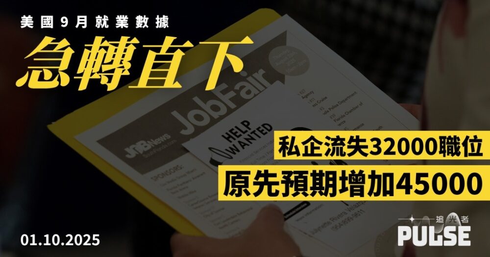 美國私人企業在9月份裁減了32,000個職位,華爾街原本預期9月新增45,000個職位,但實際卻大幅下滑,顯示企業在經濟不確定性下更趨謹慎,加劇了外界對勞動力市場急速疲弱的擔憂。若果美國政府周三(1日)開始的停擺持續,相信對就業市場造成更大壓力。