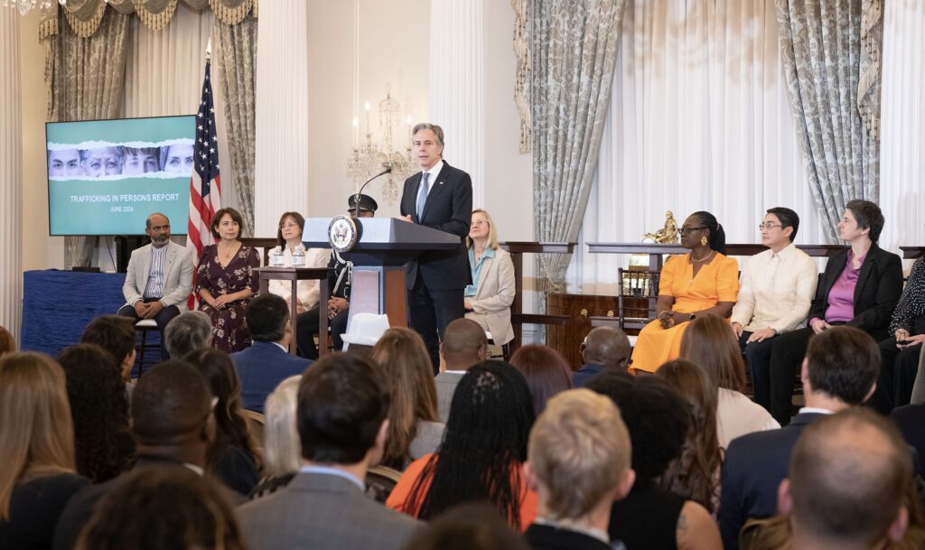 美國國務卿布林肯在致辭中特別提到緬甸,人販子通過虛假的招聘廣告承諾高薪招聘,被帶到緬甸一個與世隔絕、嚴密看守的地方,他們的手機被沒收,囚禁者被迫在網上從事詐騙活動,包括詐騙美國公民,設下愛情騙局誘騙受害人投資偽加密貨幣。他認為,沒有任何一個國家能夠單獨解決人口販運問題,必需結合其他國家的政府、公民社會、跨國組織,公民以及倖存者合作。