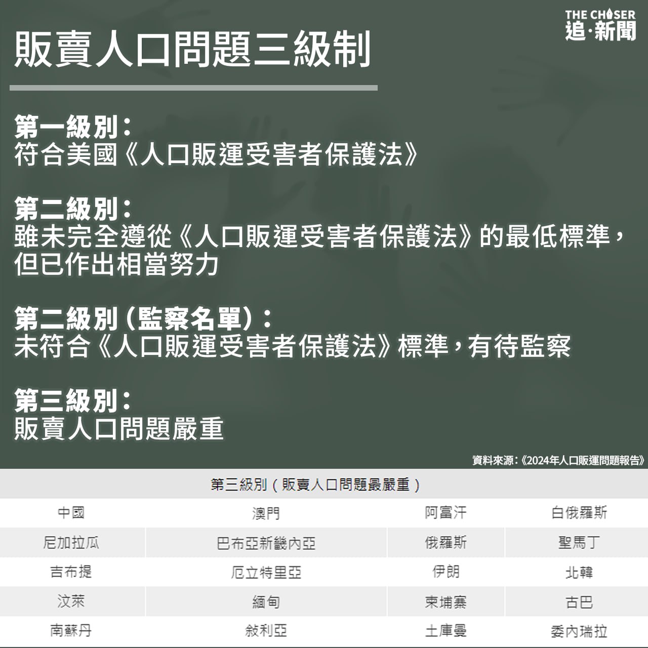 中國則自2017年開始,連續第8年被列為狀況最嚴重的第三級別國家,報告更首年將13國列入「有據可查」的政府參與販賣人口活動,當中包括中國在內,其他國家還有北韓、伊朗、緬甸、俄羅斯、敍利亞等國。這13國存在國家級「有案可查的政策或模式」,包括政府資助項目中的販運、政府附屬醫療機構或其他部門的強逼勞動、政府集中營的性奴役或招募,徵用童兵等等。