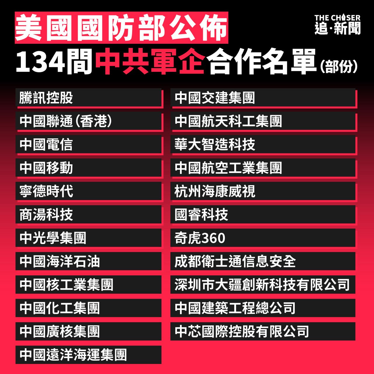 美國國防部發出的中國軍企名單是根據《2021國防授權法案》第1260H條正式授權,目前有134間中國公司榜上有名。在美中關係持續緊張之際,這份名單對美國企業與這些公司進行商業往來的風險發出明確警告,並限制構成國安風險的中國公司,還可能促使美國財政部擴大制裁這批公司。