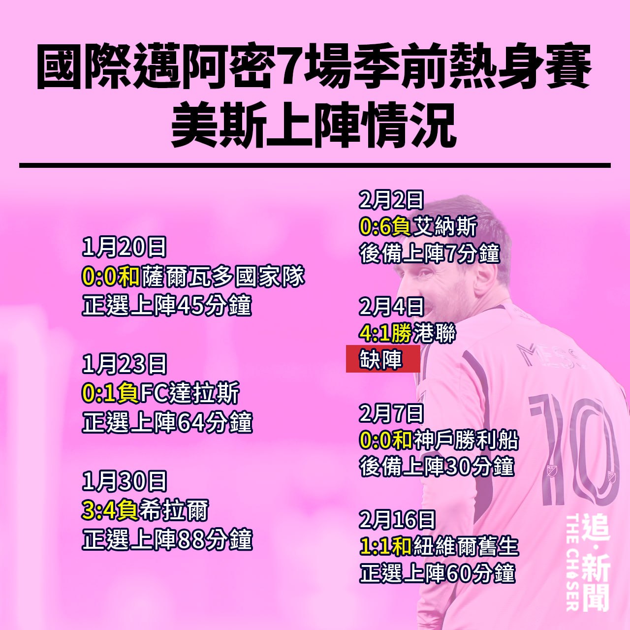 國際邁阿密亦完成今次世界巡迴的7場季前熱身賽,取得1勝3和3負,美斯合共上陣294分鐘射入1球12碼,球隊唯一一場勝利就是美斯唯一一場缺陣對港聯的賽事。