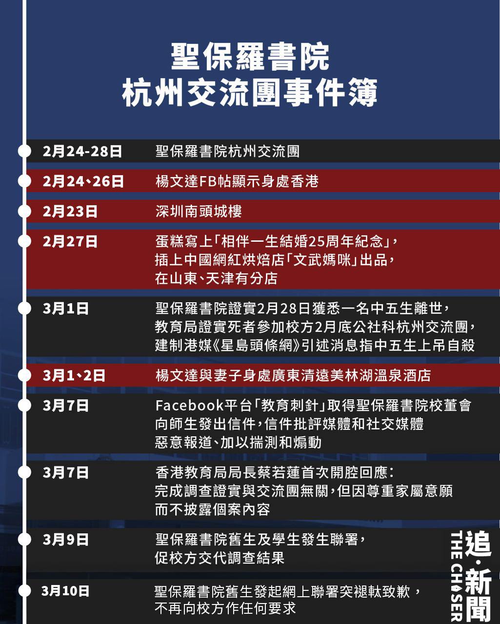 聖保羅書院一名中五男生於2月底參加香港DSE公民及社會發展科中國考察團,校方於上周一(3日)發新聞稿證實學生身故消息,建制港媒《星島頭條網》引述消息指該男生在杭州交流期間上吊自殺,校方與教育局遲遲未公開交代原因,香港家長擔心準備應考DSE的子女被逼強制北上交流,人身安全成疑。