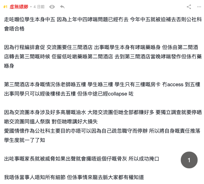 網上流傳指,死者去年因中四哮喘問題沒有參加公社科中國考察團,而交流期間要住3間酒店,出事的學生本身有哮喘藥在身,但由第2間酒店轉到第3間時,他將藥留在第2間酒店內,到第3間酒店當晚哮喘發作但沒藥在身。由於老師住5樓、學生在3樓,出事的同學只能經樓梯走上5樓,但中途已暈倒,而出事的家長就被威脅如出聲就不能取回骨灰,所以成功掩口。
