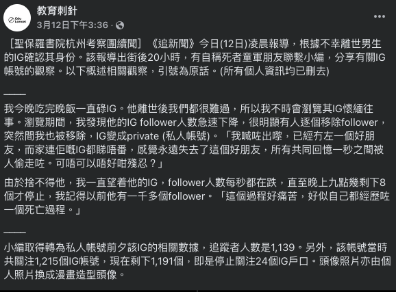 Facebook《教育刺針》平台接獲死者的童軍朋友報料指,當《追新聞》於香港時間周三(12日)凌晨公開死者IG賬號後,Manco的賬號迅速「被清空」,「我今晚吃完晚飯一直碌IG。他離世後我們都很難過,所以我不時會瀏覽其IG懷緬往事。」該報料者說:「我喊咗出嚟,已經冇咗一個好朋友,而家連佢嘅IG都睇唔番,感覺永遠失去了這個好朋友,所有共同回憶一秒之間被人偷走咗。可唔可以唔好咁殘忍?」Manco社交平台的追隨者(follower)人數每秒急跌,直至晚上9點許剩下8個才停止,「我記得以前他有一千多個follower。這個過程好痛苦,好似自己都經歷咗一個死亡過程。」