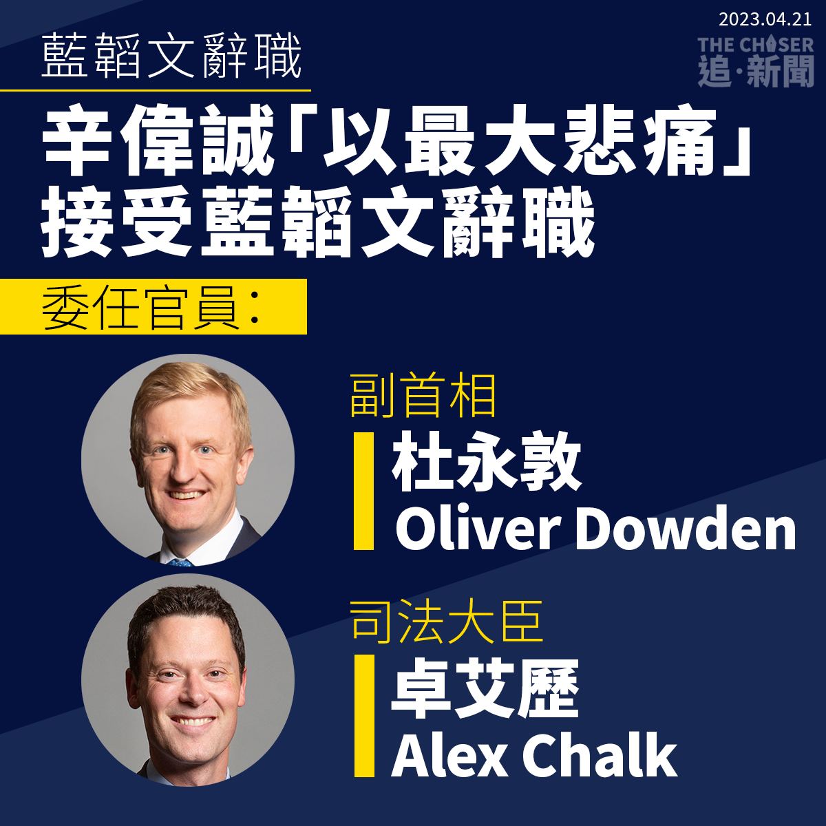 (不斷更新)英國副首相兼司法大臣藍韜文(Dominic Raab)捲入職場欺凌風波,周五(21日)宣佈請辭。他發Tweet貼上辭職信表明接受獨立調查結果,指自己「責無旁貸」(duty bound),但他對於獨立法官Adam Tolley KC撰寫的報告,認為兩項指控存在「缺陷」,會導致優良政府的操作陷入危險程序,批評調查開創危險先例。首相辛偉誠表示「以最大悲痛」接受藍韜文辭職,同日委任杜永敦(Oliver Dowden)為副首相,司法大臣空缺由卓艾歷(Alex Chalk)接任。
