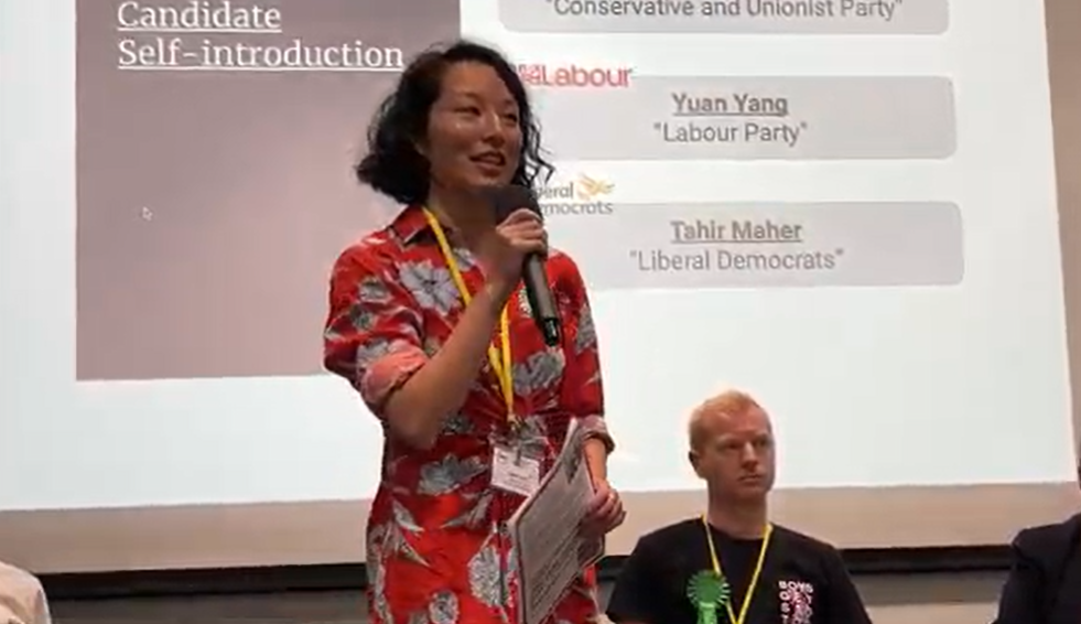 在雷丁新劃選區Earley and Woodley參選、來自中國的楊緣(Yuan Yang),她4歲時隨父母在1990年代初期移居英國,當時從事學術研究工作的父母在1989年經歷天安門事件,35年過去,香港經歷同一情況,將香港人帶到英國這片地方,「父母的犧牲承傳了我,在英國接受良好教育,在民主的土壤上成長,如今站在這裡、站在自由公平之地參選。」