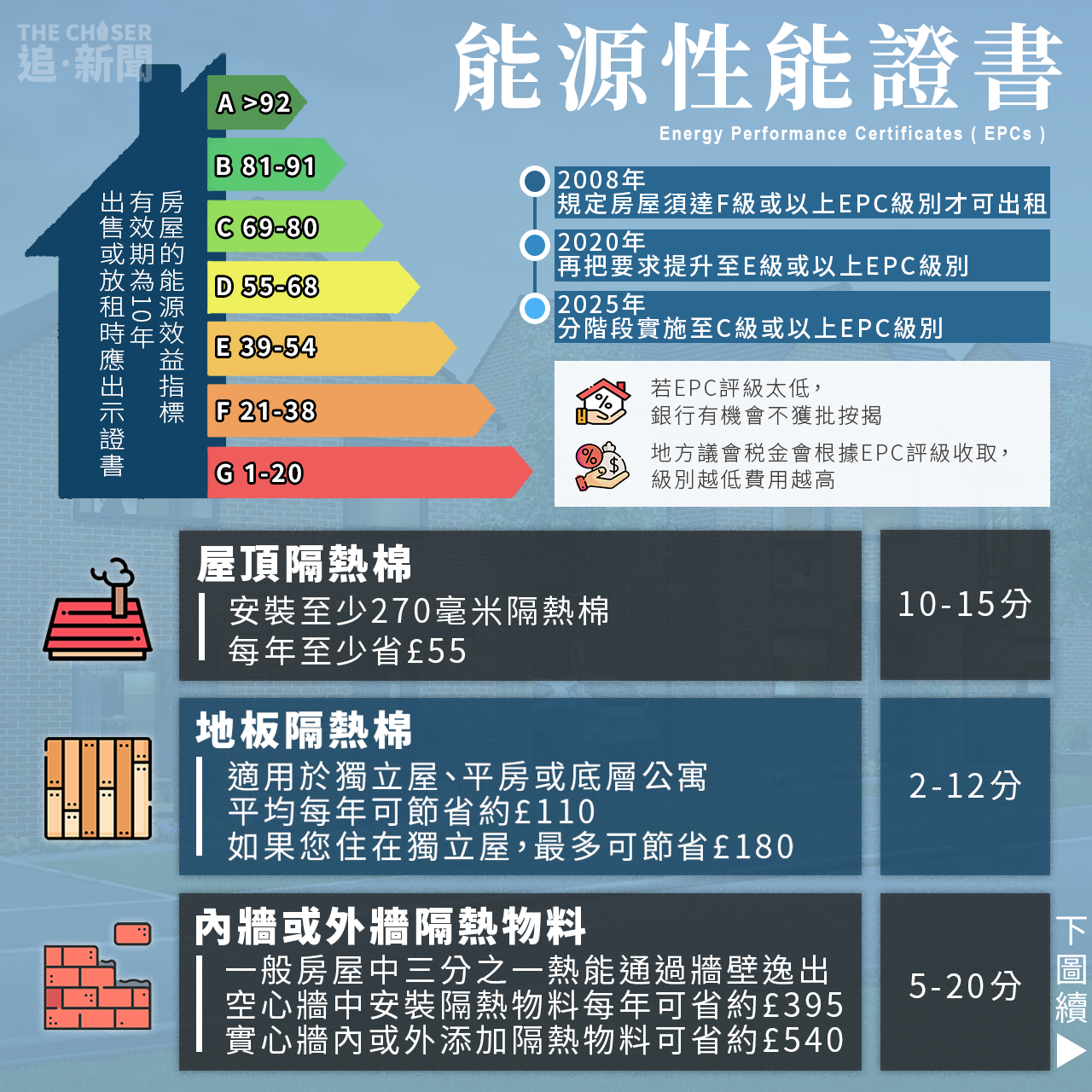房屋方面,能源性能證書(EPC)則是買家或租戶必須考量的因素。英國政府透過EPC評估建築物的能源效率級別,以A為最高效益,按耗能量分A至G級。自2022年起新出租物業須達D級以上;2025年起出租物業的EPC級別須達C級或以上,不達標的物業業主可能被罰款£500至£5,000。