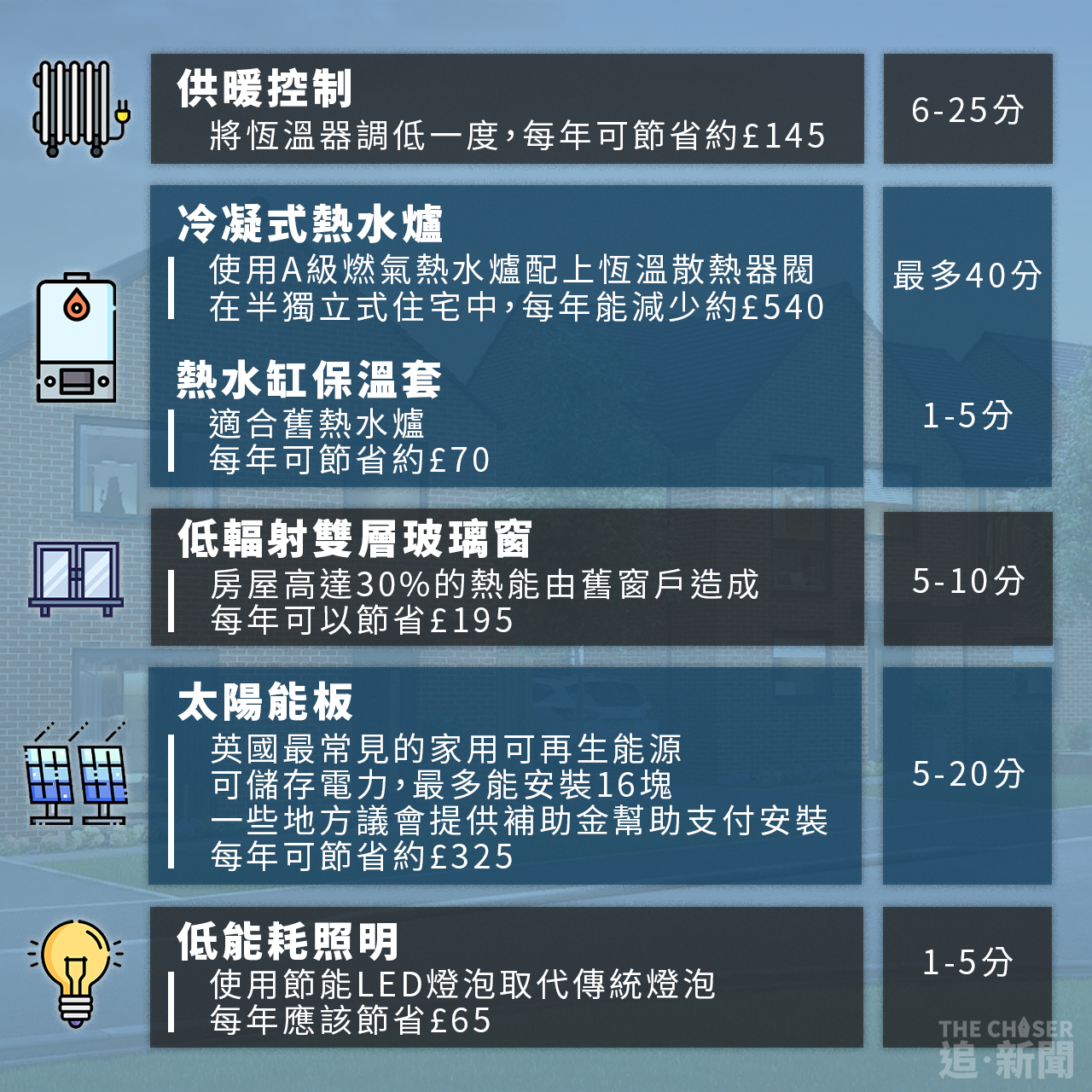 - 英國政府透過EPC評估建築物的能源效率級別,以A為最高效益,按耗能量分A至G級。