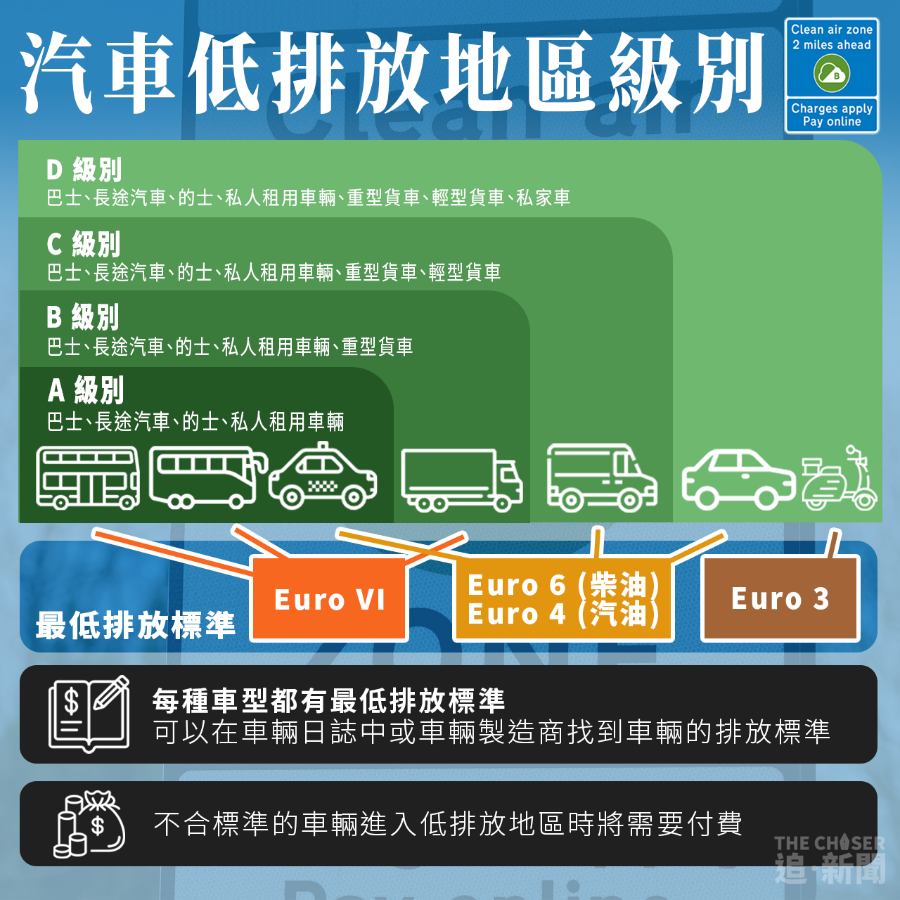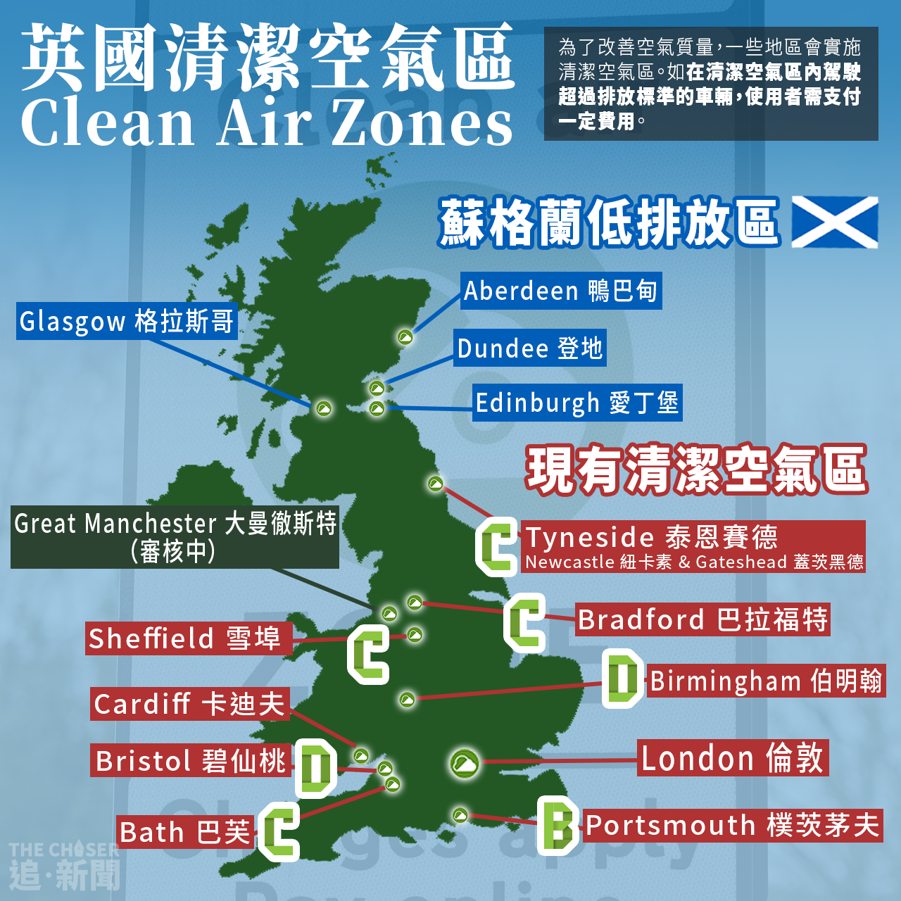 - 現時英國部份地區推行清潔空氣區(Clean air zone),對超出排放規定的車輛收取通行費。