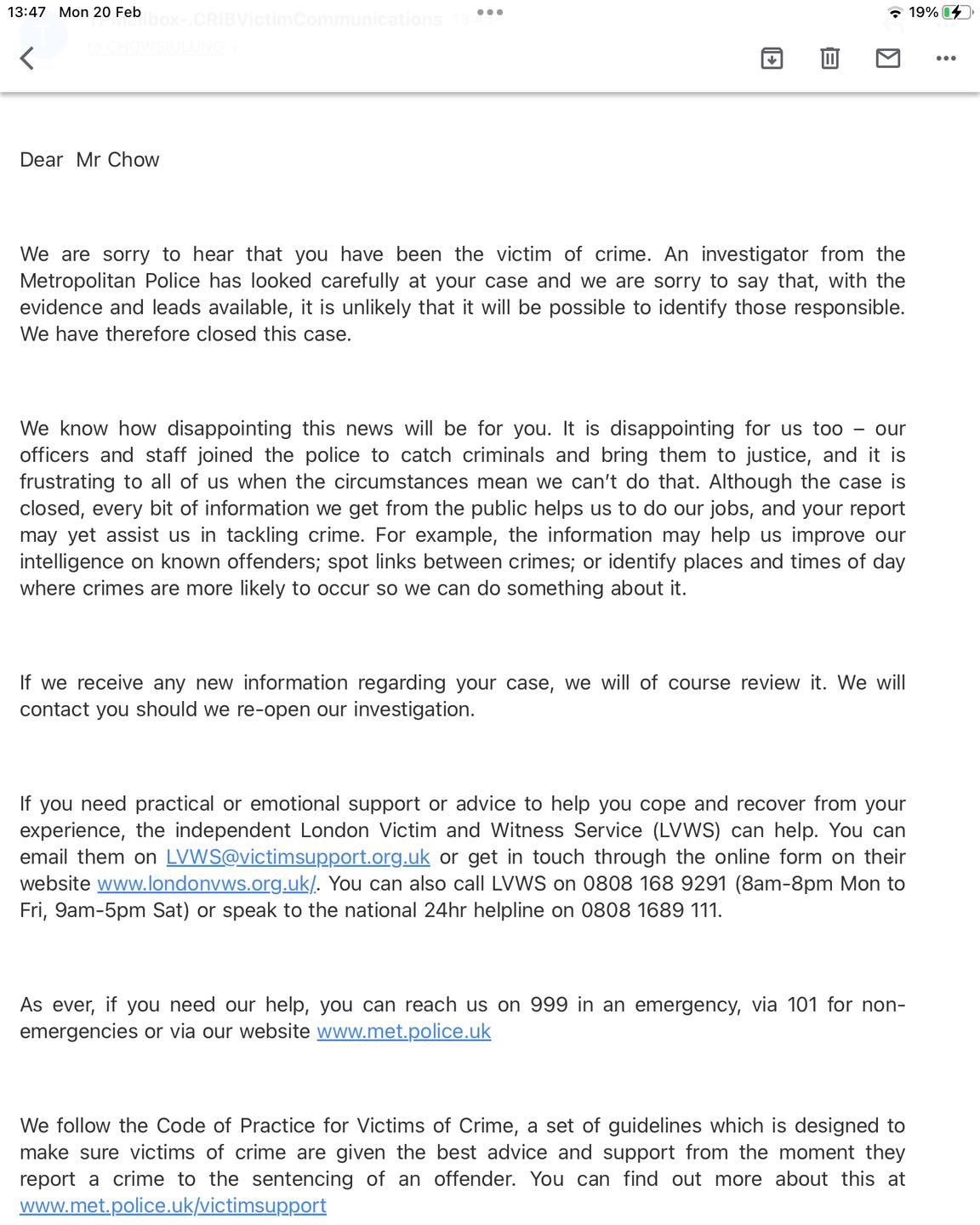 ▲倫敦警方在案發翌日下午1時許,已透過電郵回覆周小龍表示缺乏證據及線索,故終止調查。
