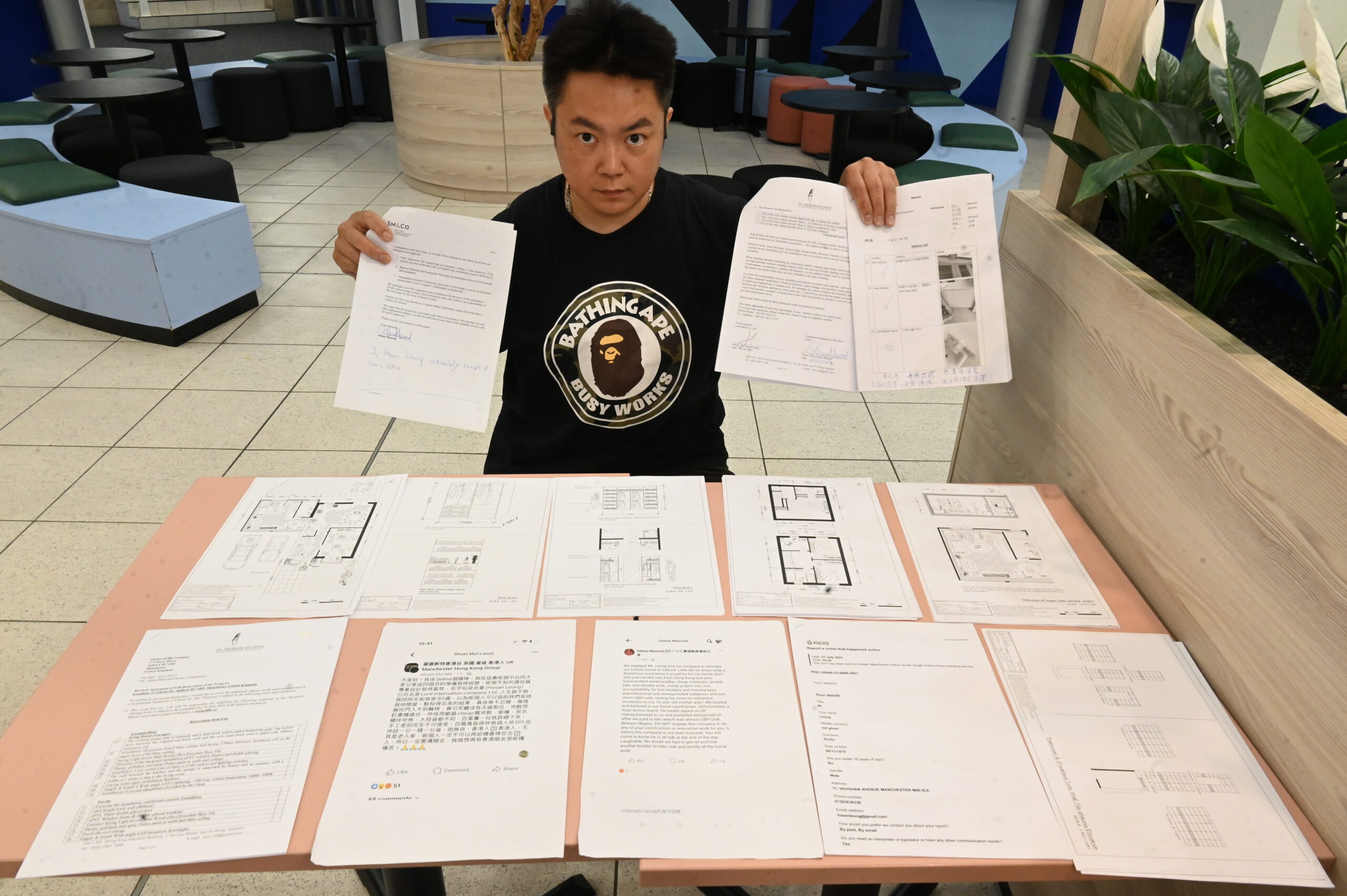 馬秀雯及其母親7月17日在曼城港人Facebook群組「曼徹斯特香港谷 英國 曼城 香港人 UK Manchester Hong Kong Group」發文,指聘用了梁兆豪的裝修公司,為她與母親跟93歲外公在曼城Salford新買入的獨立屋進行裝修,但事後發現貨不對辦,包括位於地下的「傷殘厠所門入不到輪椅」、「地氈用釘書機逢(縫)合」、「用啲最cheap嘅地氈」、「百葉簾一拉就跌晒下來」、「大陸貨都不如」,批評手工令人無法接受,形容「百幾萬裝修仲衰過人地DIY」,帖文一出引起網民加入「公審」,留言附和表示同情,有人稱「120萬唔係一個細數嚟喎,講真成間屋都買得到」。馬秀雯母親回應稱:「我都係好蠢,以為香港人信得過,要俾返香港人做,點知激到血壓摽(飆)升。」事件亦引來多間香港媒體圖文並茂報道馬家一方說法。