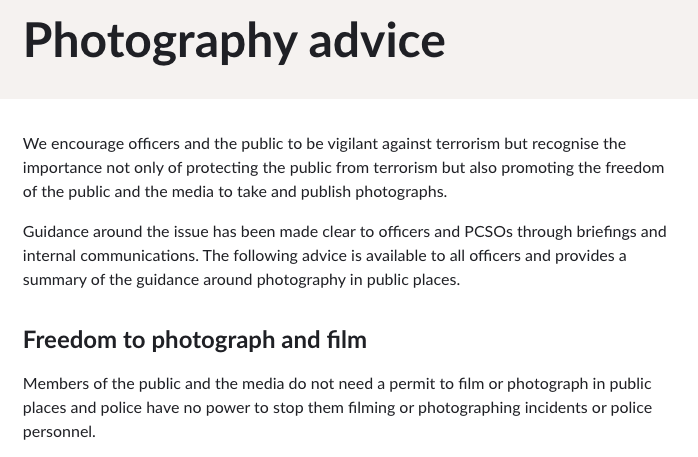 根據倫敦都市警察(Met Police)網站資料顯示,公眾及傳媒在公眾場所拍攝和錄影無需申請批准,警察無權在任何意外現場和警察執勤時阻止任何人進行拍攝和錄影工作。