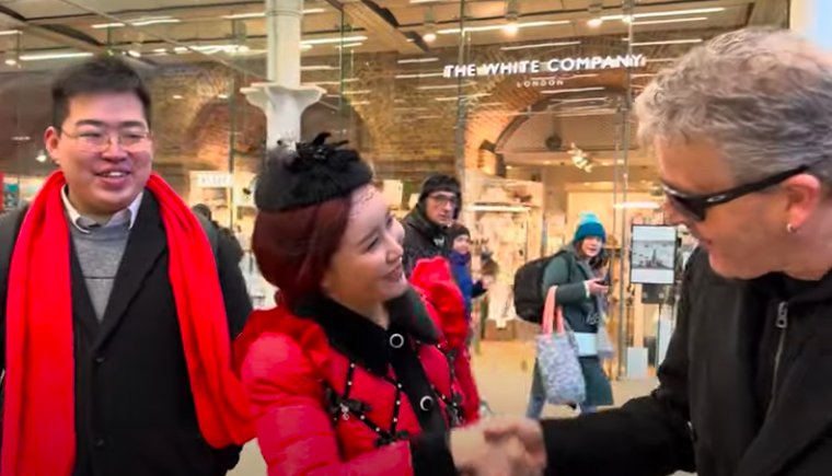 英國鋼琴家「Dr KBrendan Kavanagh上周五(19日)在倫敦St. Pancras火車站的街頭鋼琴進行公眾表演,他以為身後是來自日本的攝製隊,後來同伴介紹這隊手持五星紅旗的團隊來自中國,為駐歐洲的中國電視台進行拍攝工作。Dr K與趨前的團隊女子言談甚歡,甚至邀請其中一人即席表演彈藍調音樂。