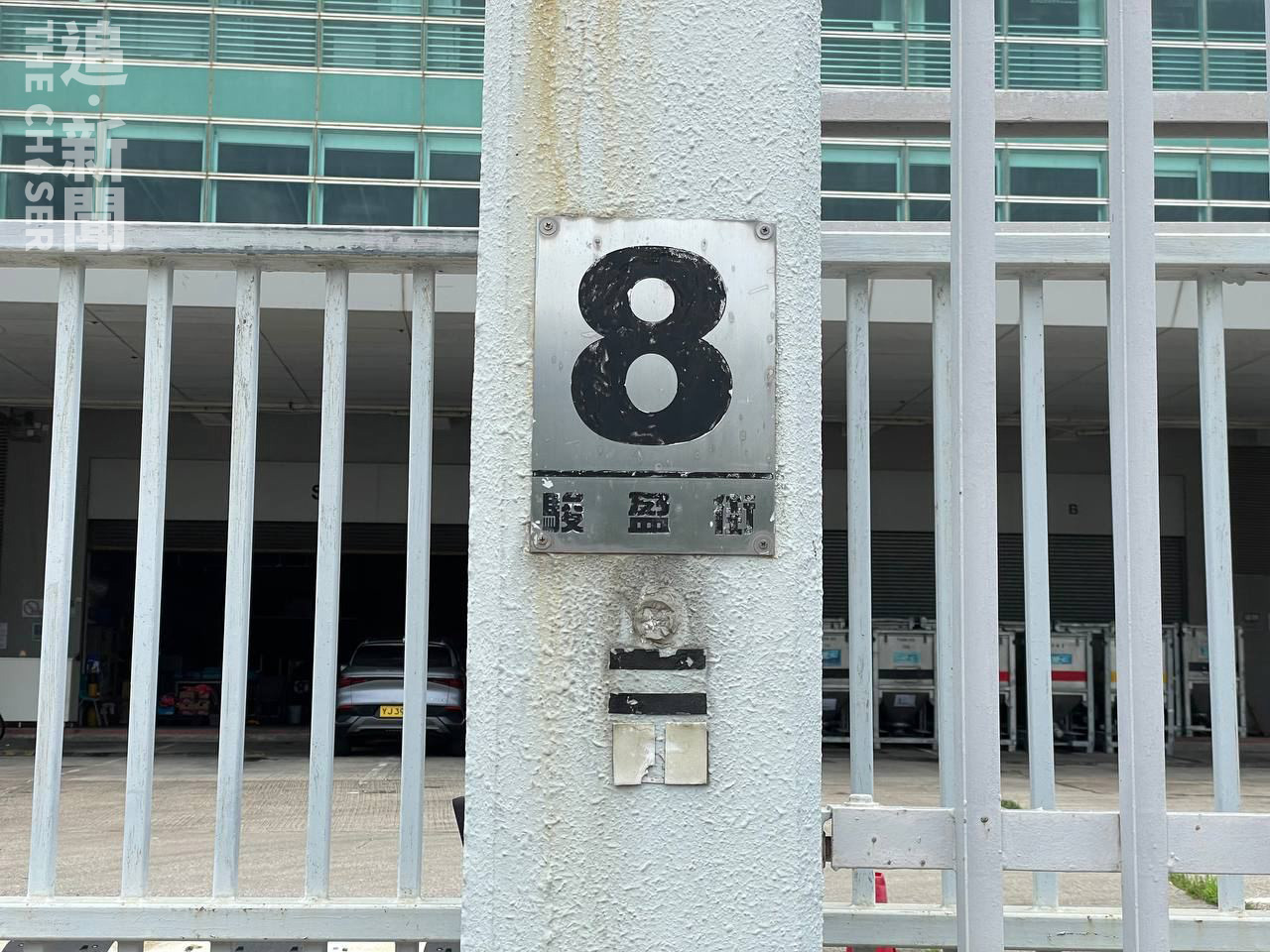 - 「駿盈街8號」地址名牌已生銹。