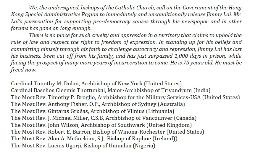 聯署10人於聲明中首先提到他們是天主教會的主教,要求香港特區政府馬上無條件釋放黎智英,「針對黎智英在其報章及其他論壇宣揚民主所作的迫害,已經持續太久了」。
