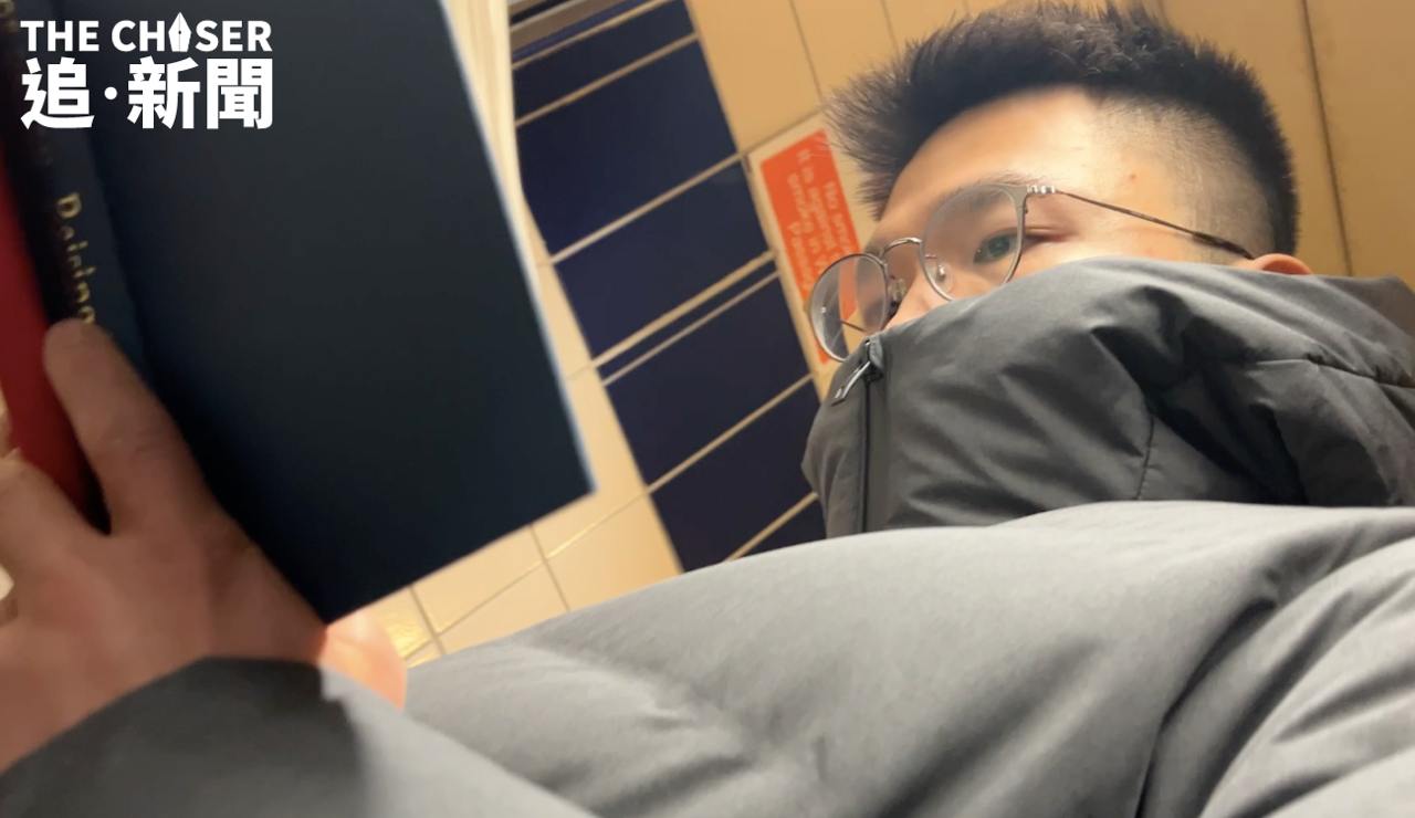 - 經貿辦副長葉昱蔚排隊進入公眾席,看書打發時間。