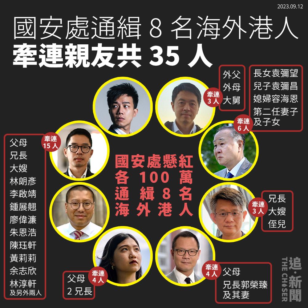 目前,國安處通緝8名海外港人,包括任建峰、袁弓夷、郭鳳儀、郭榮鏗、許智峯、蒙兆達、劉祖廸、羅冠聰,並宣佈警方就8人每人懸紅100萬元。