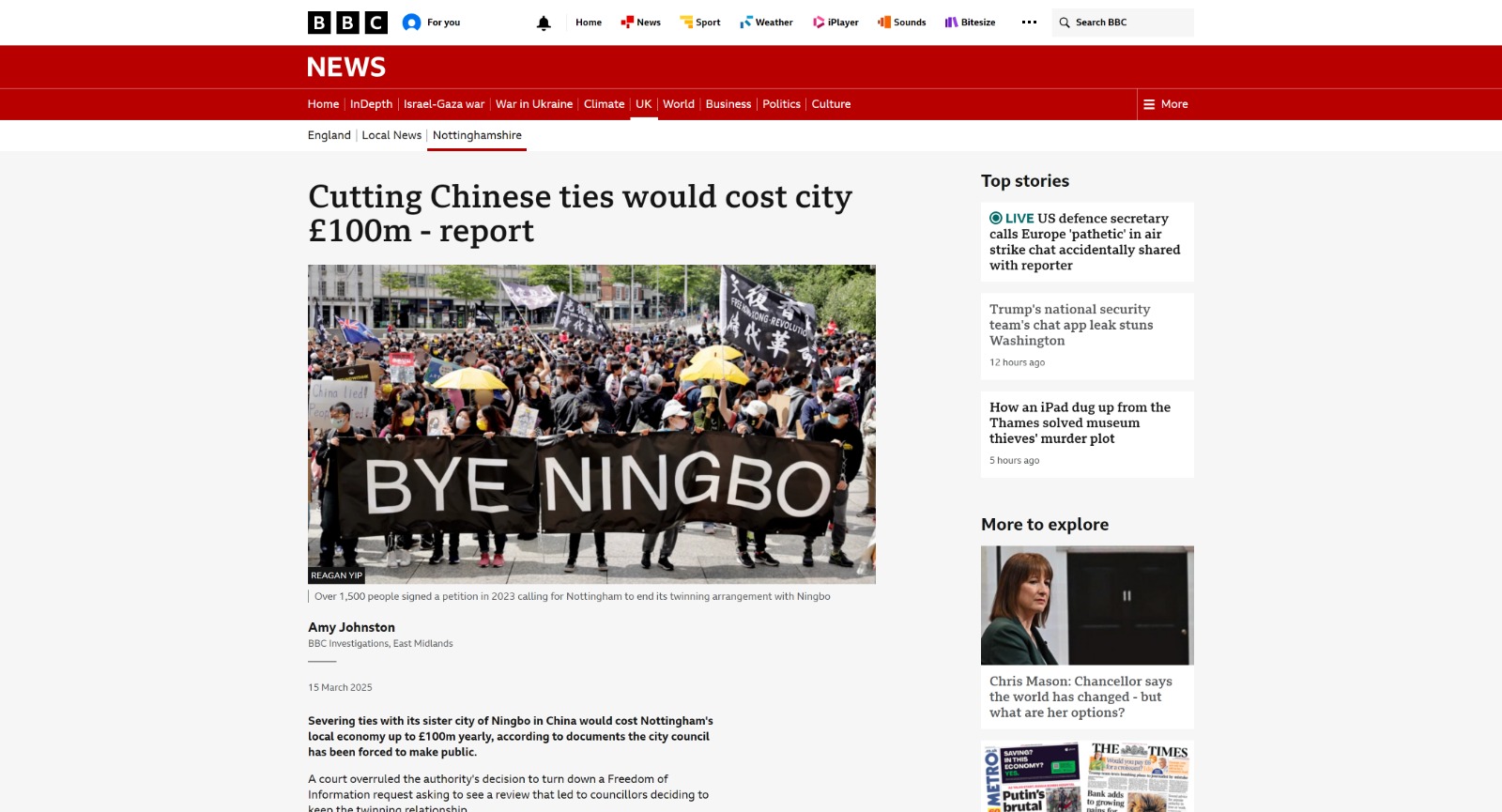 《環球時報》上周一(17日)以《評估報告:若諾丁漢與寧波斷絕關係每年將損失 1億英鎊,並嚴重損害對華關係》為題在其網站發表報道,並同日於其A3新聞背景一頁,以若四分一篇幅刊登。