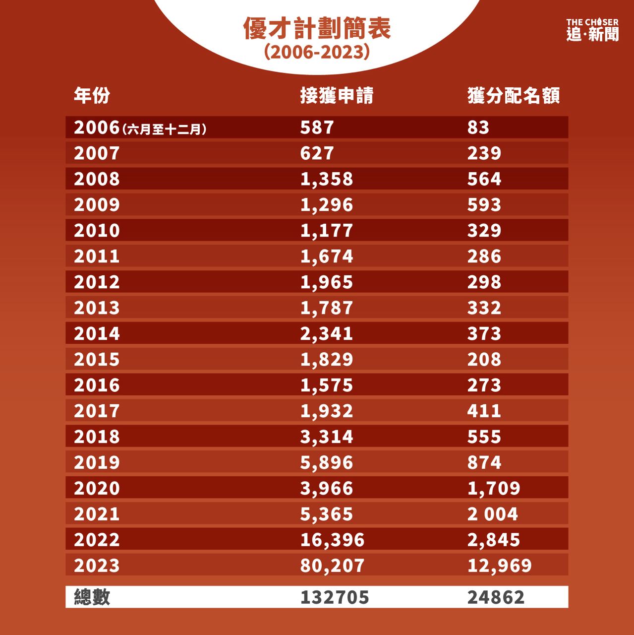 優才計劃自2006年推出時,只有1,000個配額,分別於2020年及2021年增加配額,直至去年取消年度配額,申請數目大增,獲批人數亦然,由2022年的16,396人及2,845人數,分別上升至2023年的80,207人及12,969人,升幅分別是3.89倍及3.56倍。今年施政報告提出優才計劃會再增設機制,主動邀請頂尖人才赴港發展。